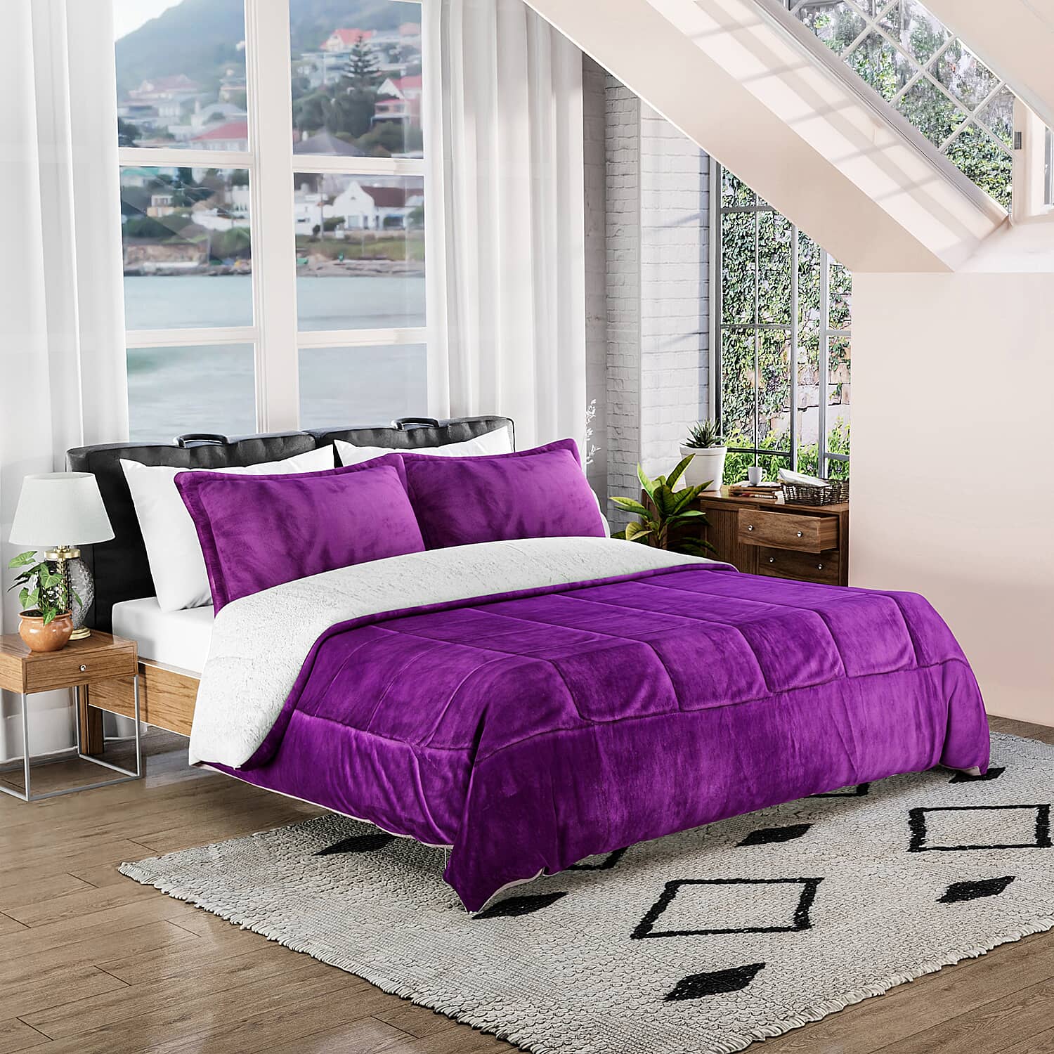 HOMESMART Purple 3 Layer Quilted Microfiber Flannel and Sherpa Reversible Comforter and Set of 2 Shams | Microfiber Comforter | Best Comforter Sets | Bed Comforters | Comforter Set for Bedro
