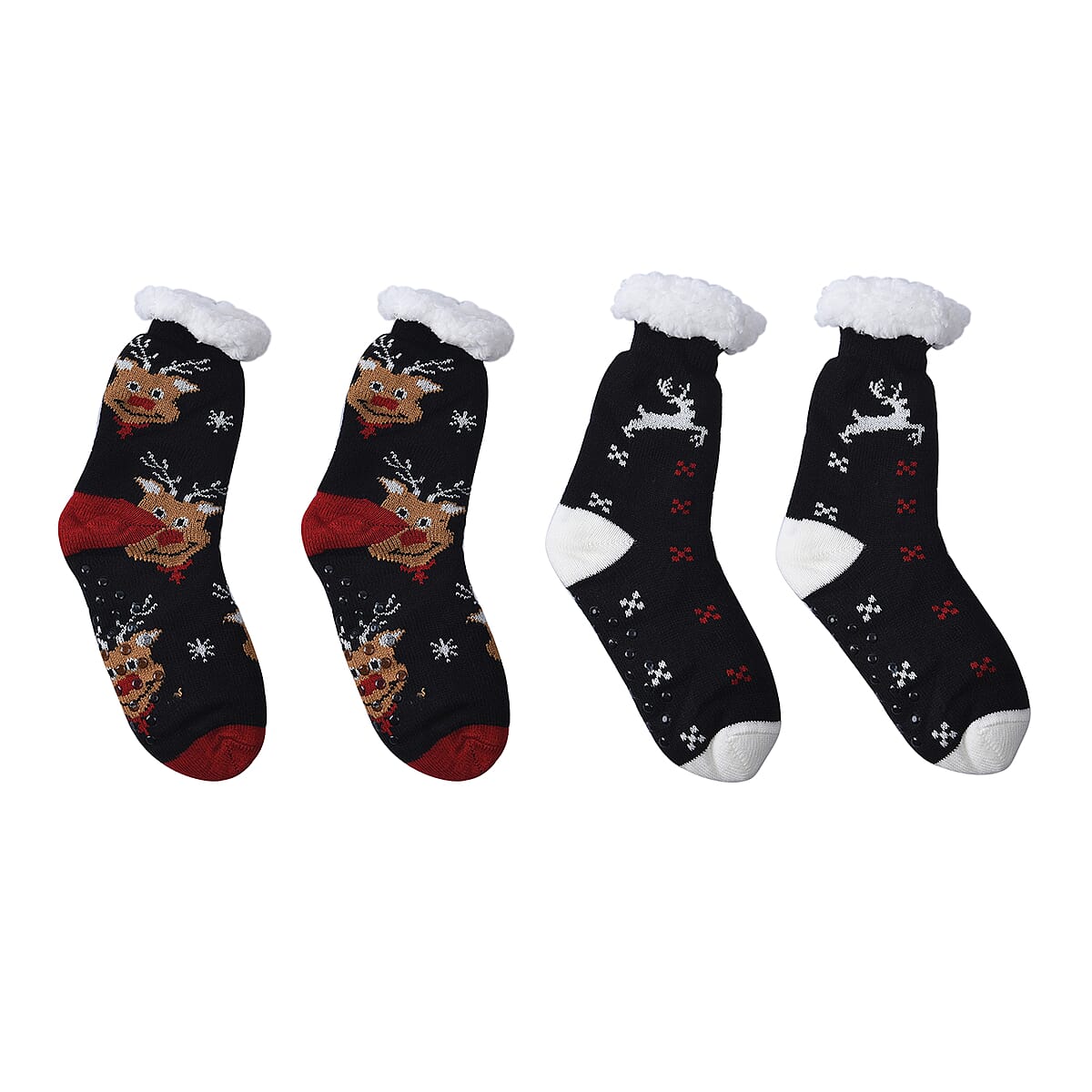 Homesmart Set of 2 Pairs Warm & Fuzzy Black Reindeer Pattern Sherpa Lined Slipper Socks (Women's Size 5-10) with Anti Slip Rubber