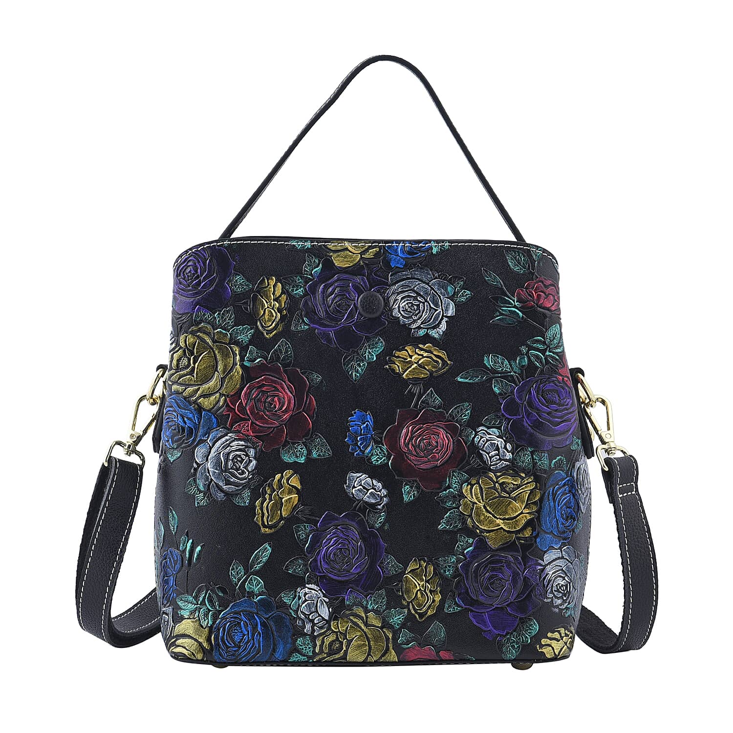 HONG KONG CLOSEOUT Collection Black Color Rose Embossed Pattern Genuine Leather Convertible Tote Bag with Handle and Shoulder Strap (8.66"x7.08"x4.33")
