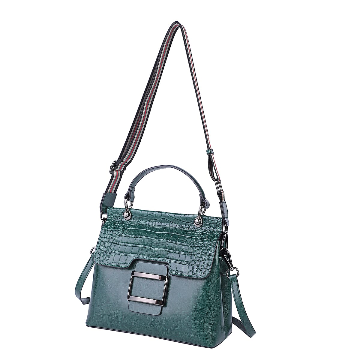 Hong Kong Closeout Collection Green Genuine Leather Convertible Tote Bag with Crocodile Embossed Pattern Flap and Set of 2 Woven & Leather Strap