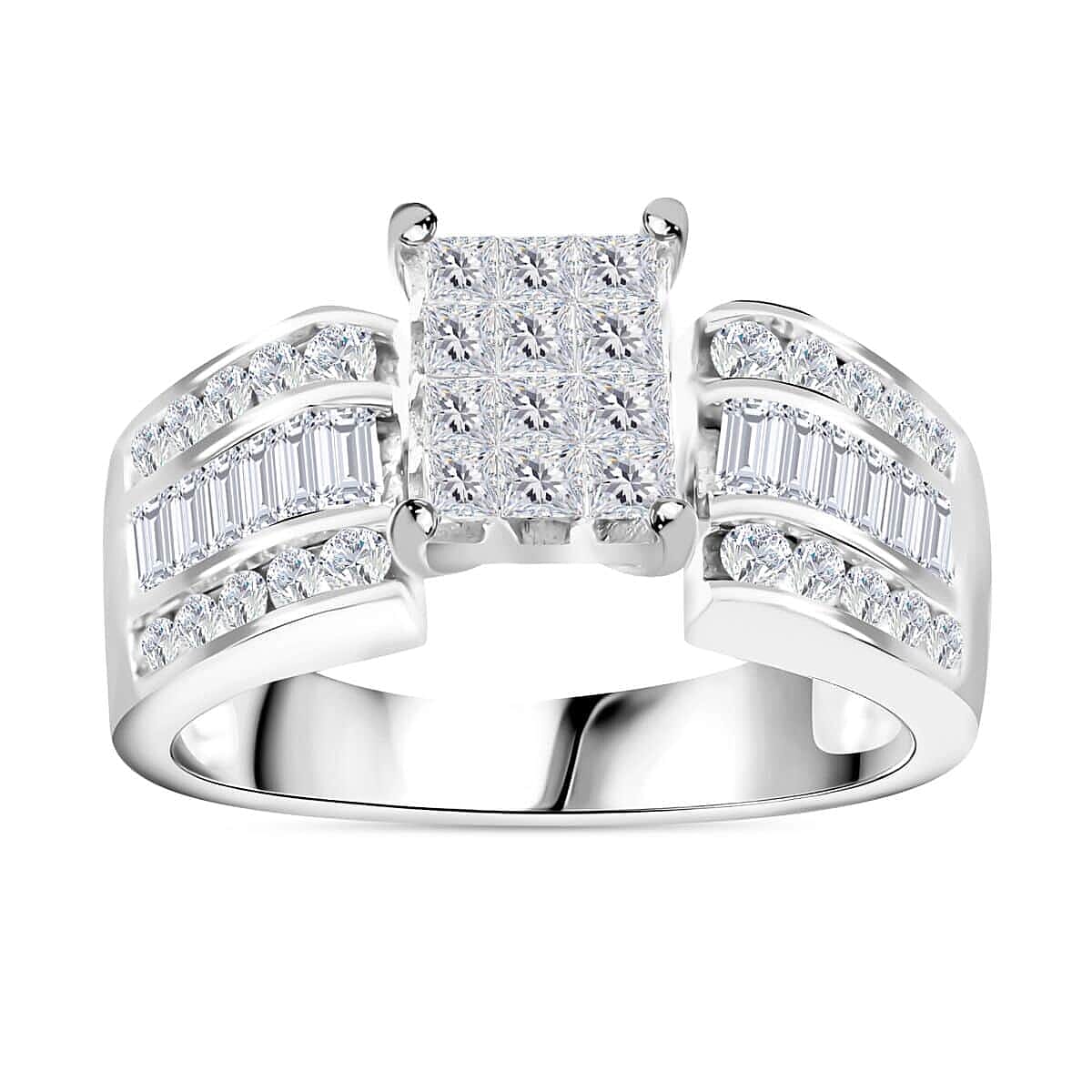 Narrating tales of unity and connection, this diamond ring in 14K white gold is inspired by the blend of the cluster and Art Deco style. Featuring a cluster of invisible-set diamonds in the center, this diamond cluster ring has channel-set diamond rounds and baguettes on the shank. Perfect as a heirloom jewelry piece, this ring can be worn in both formal and casual settings.