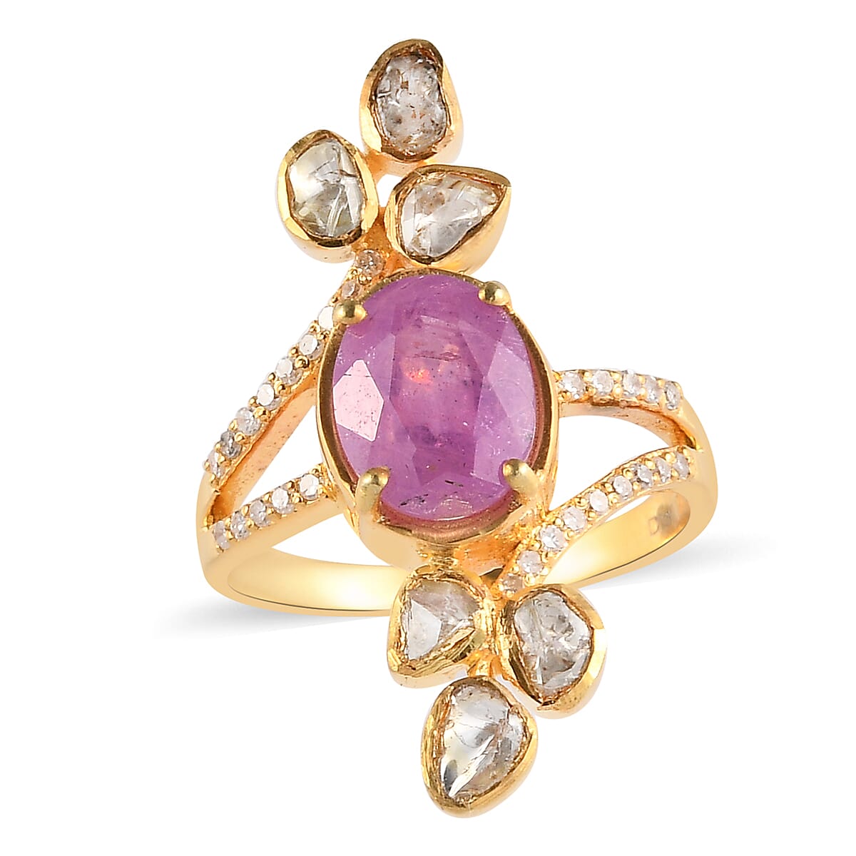 Ilakaka Hot Pink Sapphire and Polki Diamond Ring in Vermeil Yellow Gold Over Sterling Silver (Size 9.0) 2.85 ctw