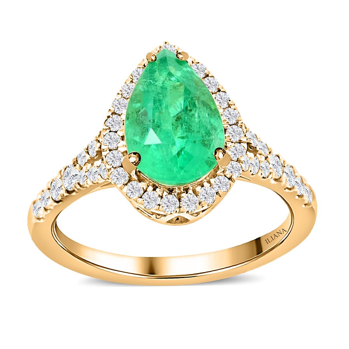 Iliana 18K Yellow Gold AAA Boyaca Colombian Emerald, Diamond (G-H, SI) Halo Ring (Size 8.5) 2.00 ctw