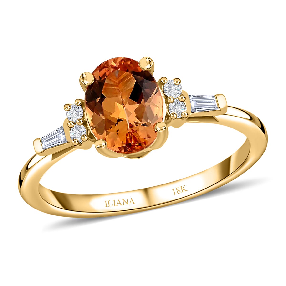 This AAA natural Imperial topaz ring reflects a contemporary look. This ring features an oval-shaped gem in the center held in prongs. This prong setting is a classic and elegant style that amplifies the brilliance and beauty of the center gem. The round diamonds on the shoulders and the baguette-shaped diamonds on the shank add a radiating look. This natural Imperial topaz ring from the Iliana collection is perfect for weddings and engagements. The color of the imperial topaz is highly prized and very rare. It is the gem of the 23rd anniversary and birthstone for November. AAA grade of the gemstone describes their excellent quality. The center gem has a beautiful display of color and clarity, making this ring look classy and alluring. This 18K yellow gold natural Imperial topaz ring is perfect for everyday wear owing to the gem’s durability.
