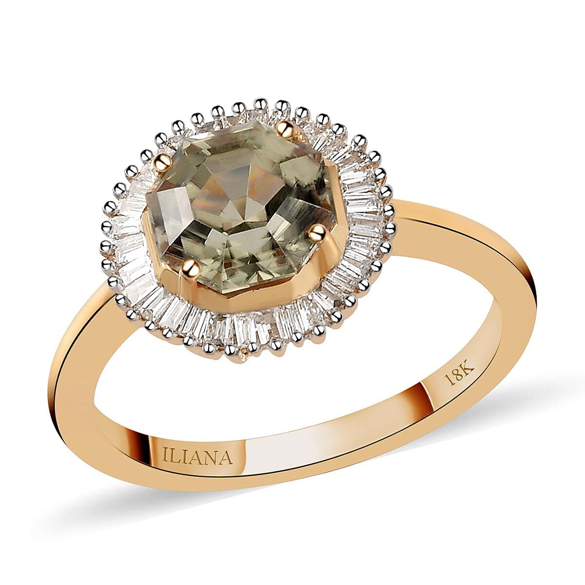 This exceptionally alluring AAA turkizite halo ring from the Iliana Collection captivates everyone’s glance at least once. Designed with the round shaped premium center gemstone, this ring is enriched with shimmering diamonds. The smooth shank gracefully holds the halo-inspired forefront, creating an extraordinary look. Crafted in 18K yellow gold, this premium gemstone ring lends a touch of royal look. With a smooth and finished under gallery, this turkizite ring is comfortable to wear for a longer period of time. Also, known as diaspore, this color-changing gemstone presents hues of soft kiwi green and pink champagne, captivating everyone’s attention. The Iliana Collection features distinctly and intuitively designed jewels in 18 Karat gold framed in premium gemstones.