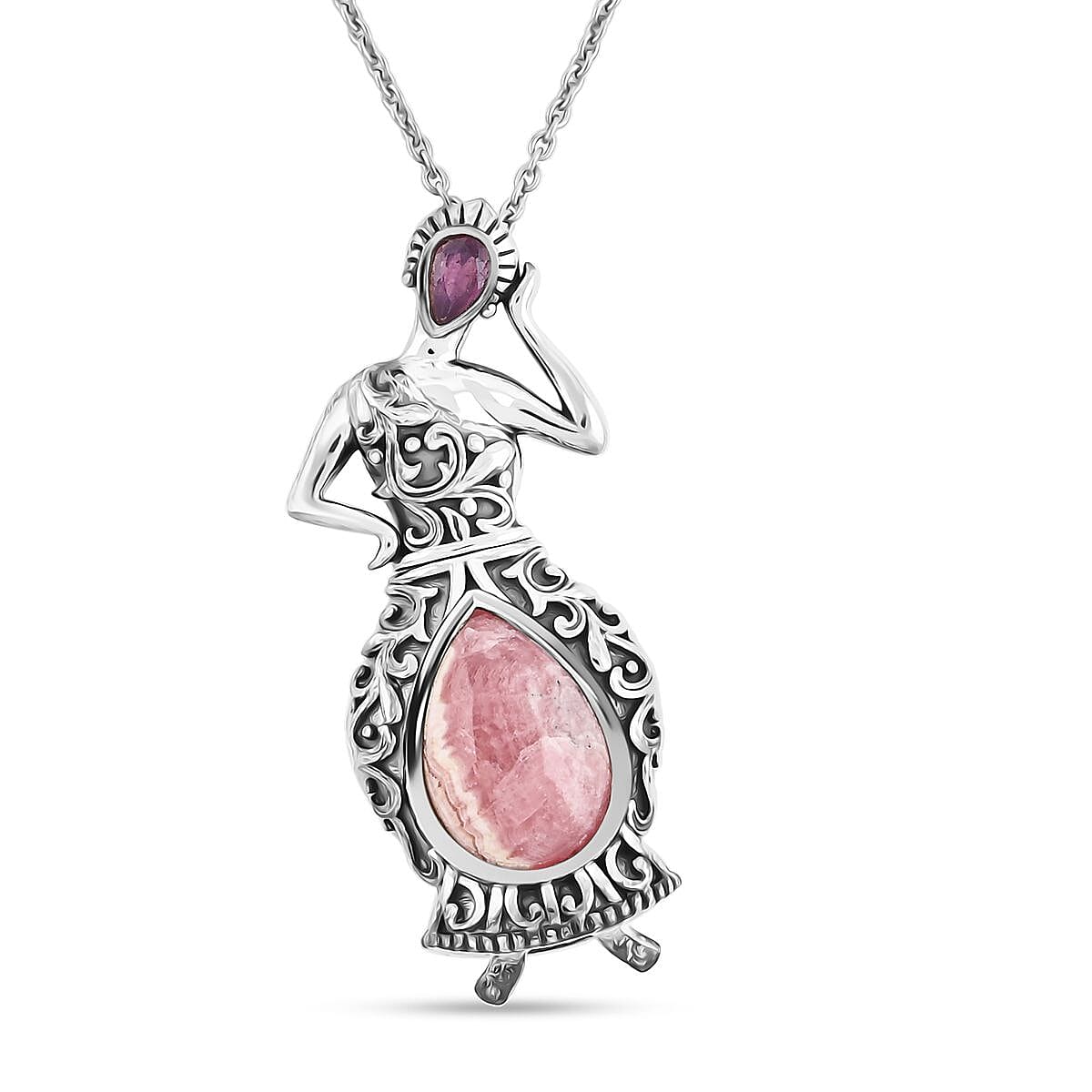 INDIA ARTISTRY Dancing Doll Collection Rhodochrosite and Niassa Ruby Pendant Necklace 20 Inches in Platinum Over Sterling Silver 10.50 Grams 7.00 ctw