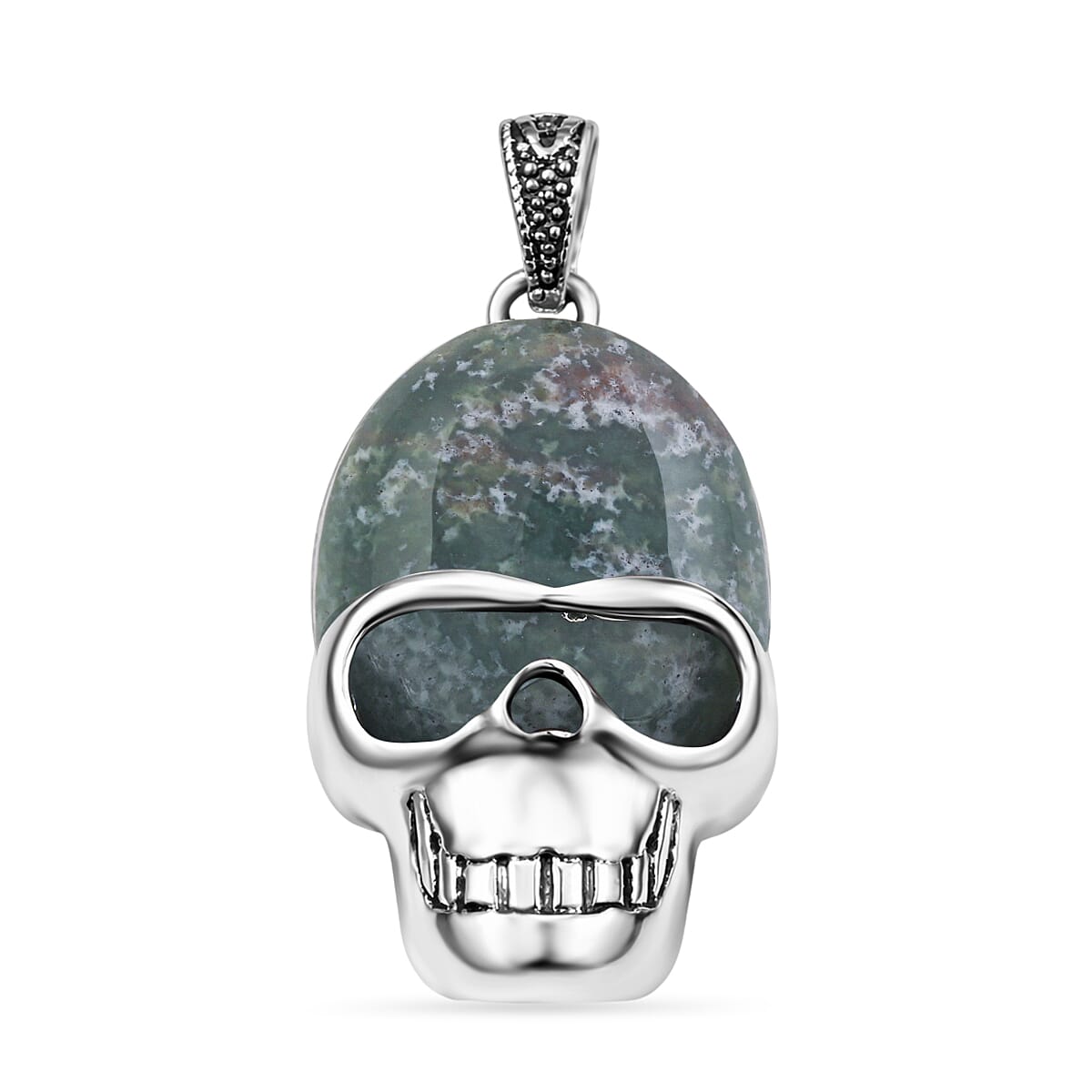 Indian Agate 15.75 ctw Skull Pendant in Silvertone with Stainless Steel Necklace 20 Inches