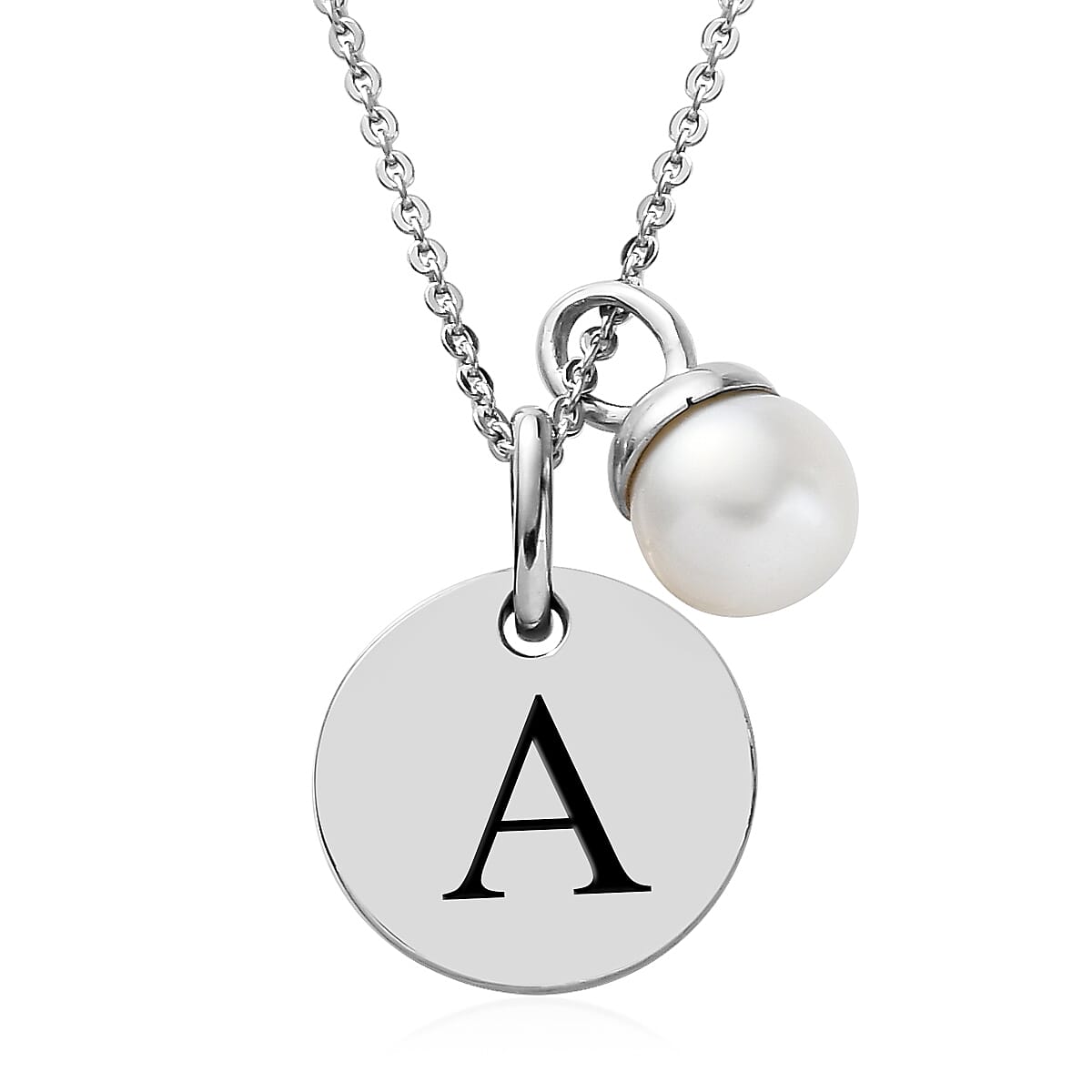 Initial Pendant Necklace with Freshwater Pearl Charm (20 Inches) in Platinum Over Sterling Silver