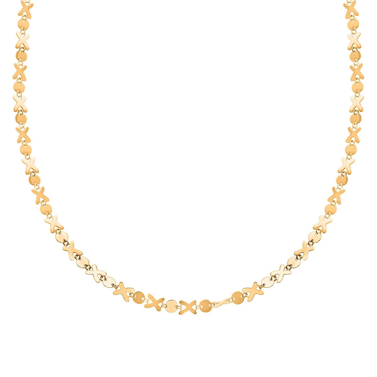 This kiss & hug elements necklace, crafted in 10K yellow gold, intersperses symbols of "X" and "O" along a sleek chain to represent kisses and hugs. This 20 inch necklace offers a charming and stylish way to express affection, making it a perfect gift for someone special.