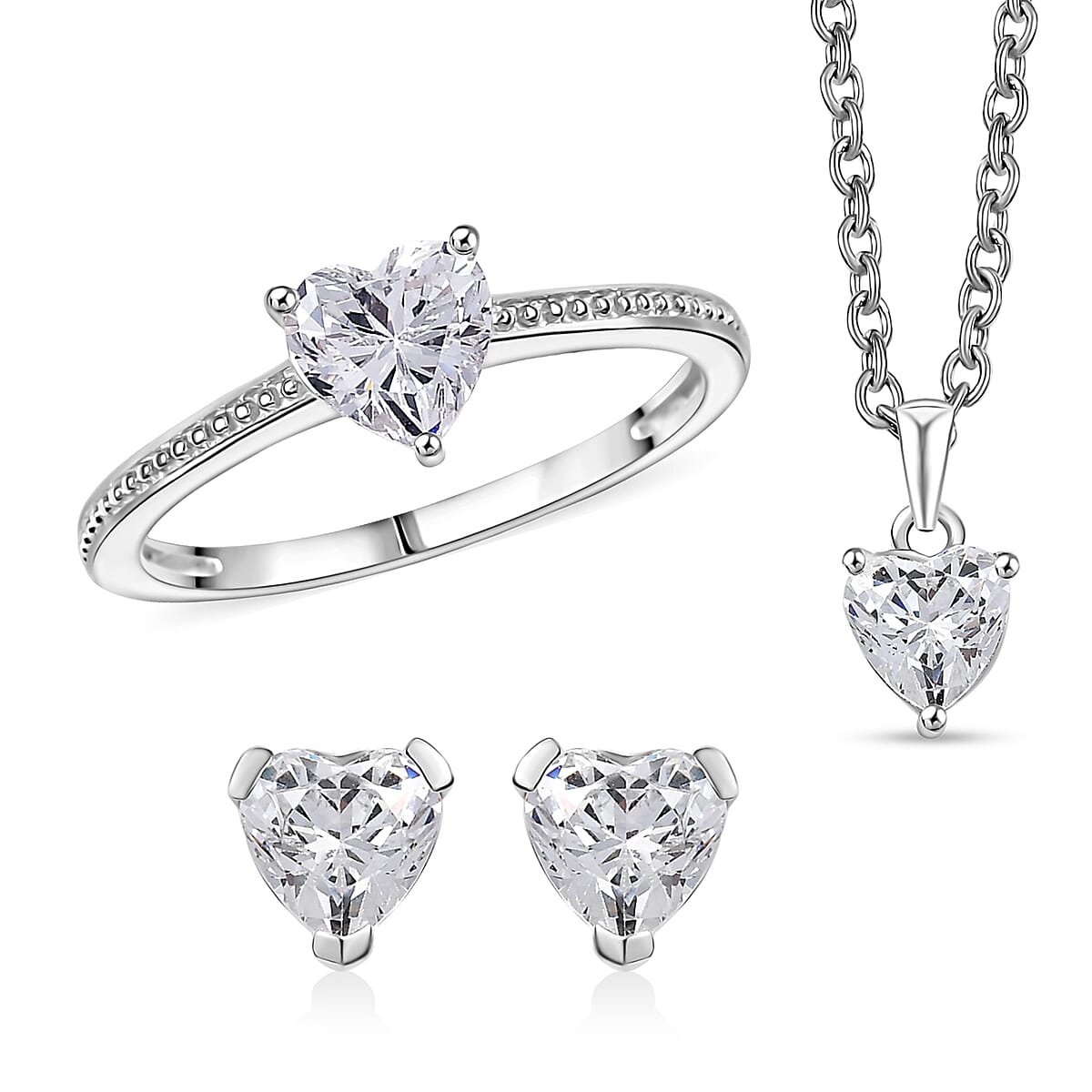 J Francis Embellished with Zirconia by Swarovski 3.80 ctw Luna Love Earrings, Ring (Size 9.0) and Pendant in Platinum Over Sterling Silver with Stainless Steel Necklace 20 Inches