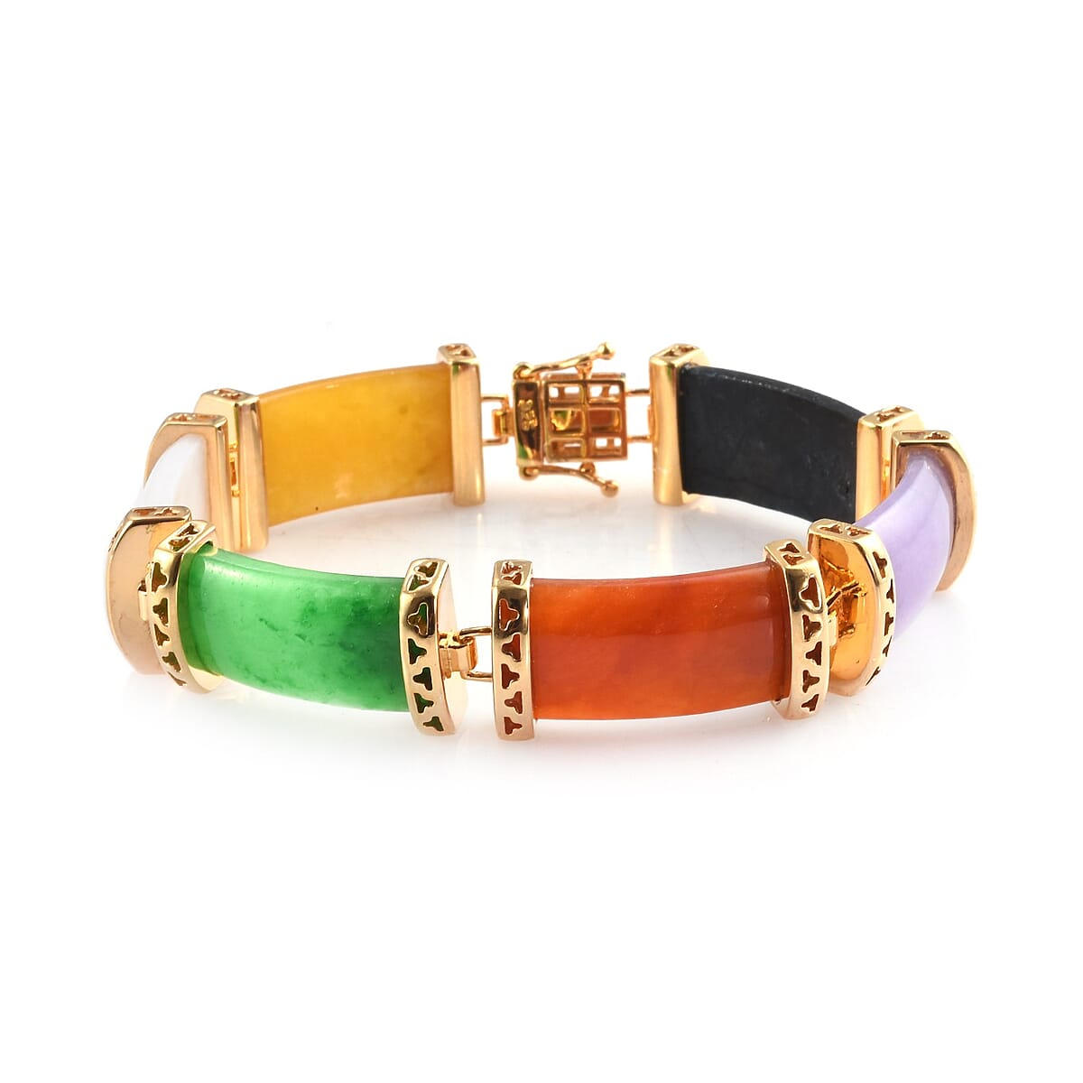 This multi-color jade bracelet can serve as a signature jewelry piece in your collection. Decked with fancy shaped colorful jade gemstones, this bracelet is featured in yellow gold over sterling silver. The beautiful metal work holding the gemstones creates a classy with maximum safety.