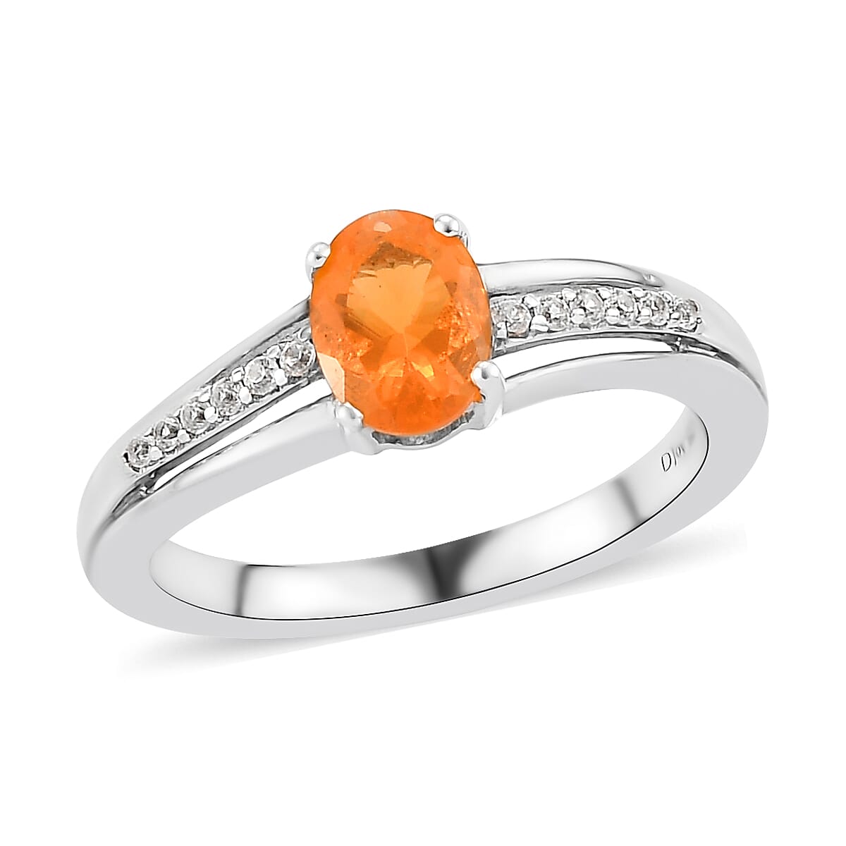 Jalisco Fire Opal and Natural White Zircon Ring in Platinum Over Sterling Silver 0.65 ctw