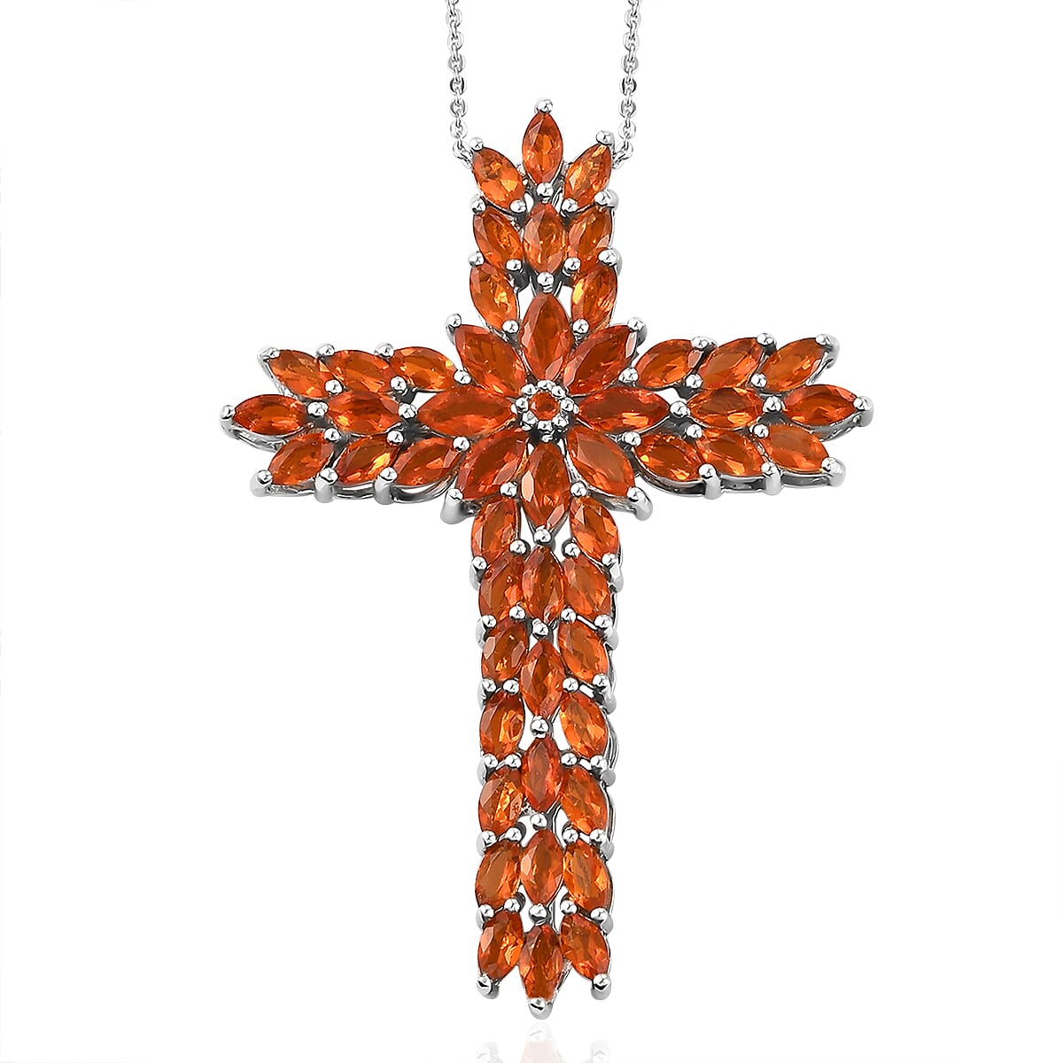 Jalisco Fire Opal Cross Floral Spray Pendant Necklace 20 Inches in Platinum Over Sterling Silver 9.35 Grams 5.50 ctw