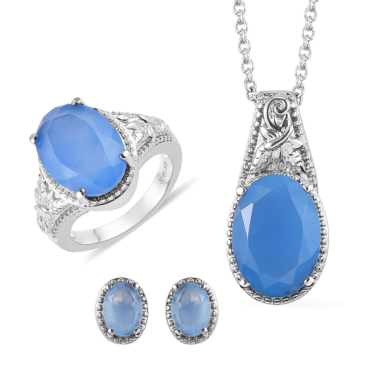 Jewelry Set of Blue Onyx Solitaire Ring , Stud Earrings and Solitaire Pendant Necklace (20 Inches) in Stainless Steel 10.60 ctw, Tarnish-Free, Waterproof, Sweat Proof Jewelry Set