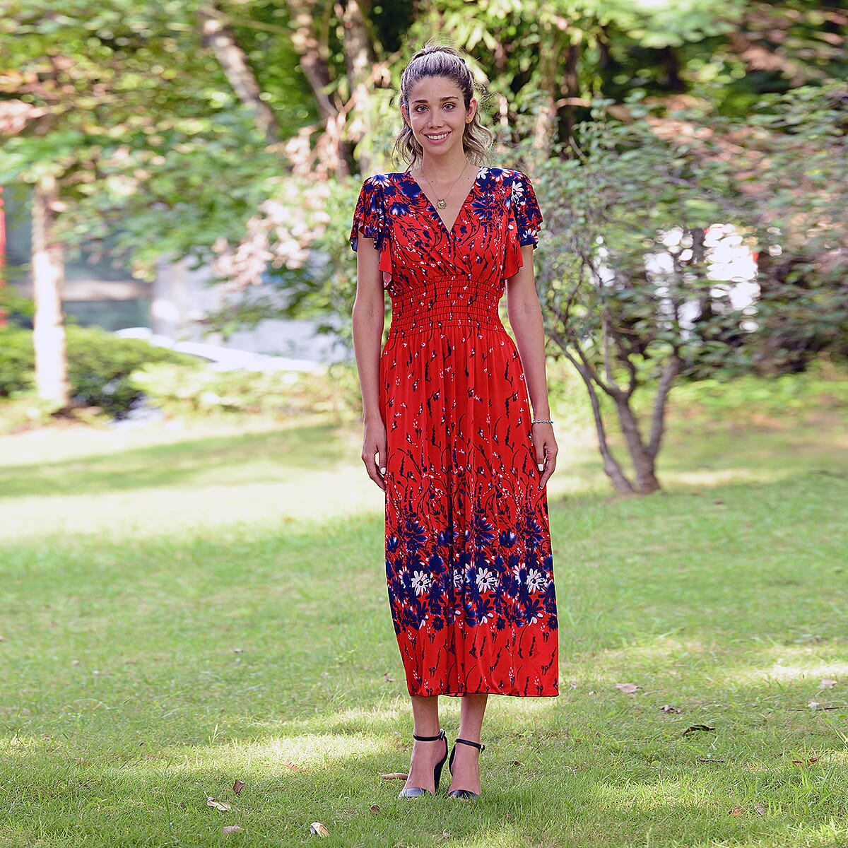 This gorgeous maxi dress from TAMSY is ideal for wearing every day. It comes with a short-sleeve design and v-neckline to give you an appealing look. The smoky waist adds a stylish touch to the dress. This dress for women is made with premium polyester fabric to make it durable and skin-friendly. Wear this v-neck maxi solo when heading outdoor, to parties, or more.