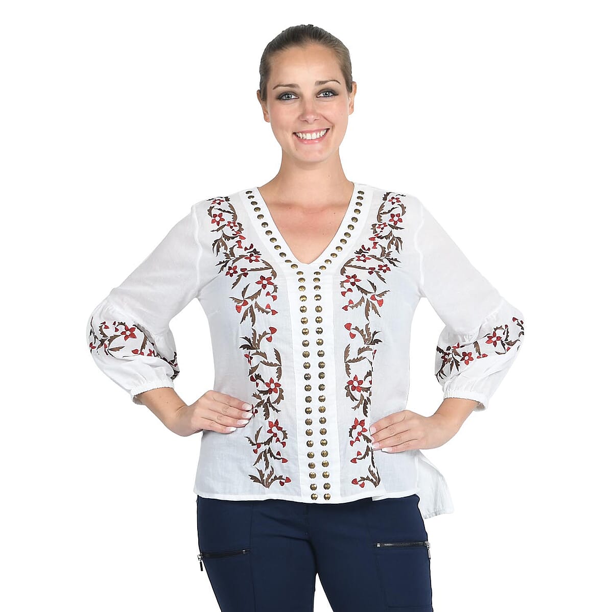 Define your casual contingent with feminine and modern styles by investing in this blouse by Jovie. Combining studs embellishment on neckline and hemline along with embroidered floral work for a stylish touch, this lightweight creation comes finished with long bubble sleeves lending graceful look to the wearer.