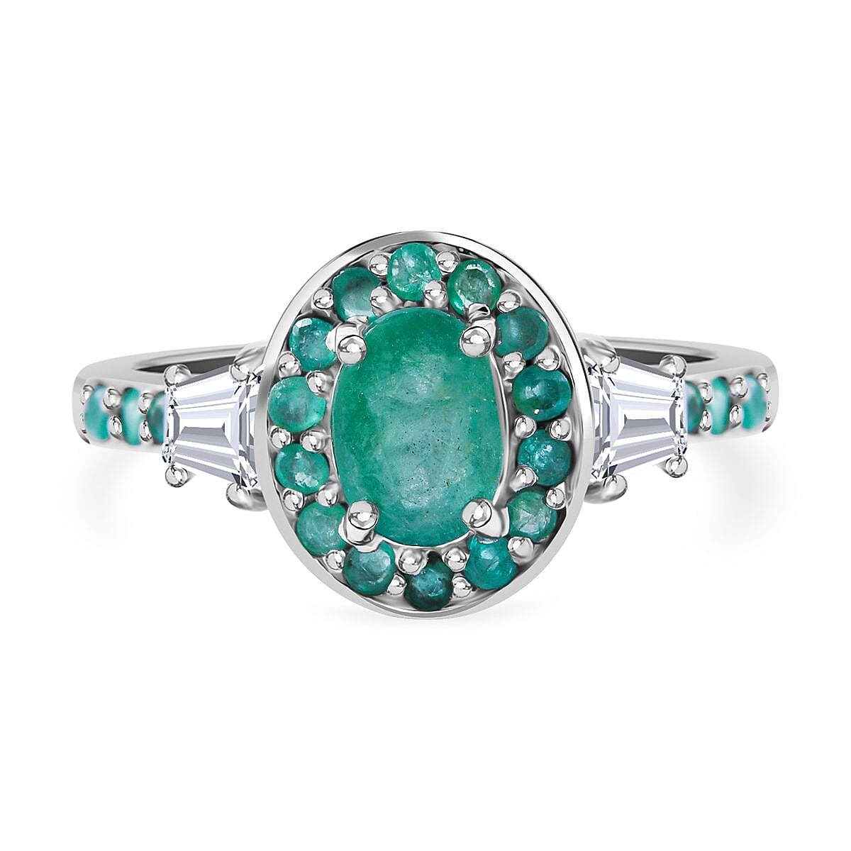 Kagem Zambian Emerald and White Zircon 1.50 ctw Luminous Crown Ring in Rhodium Over Sterling Silver (Size 8.0)