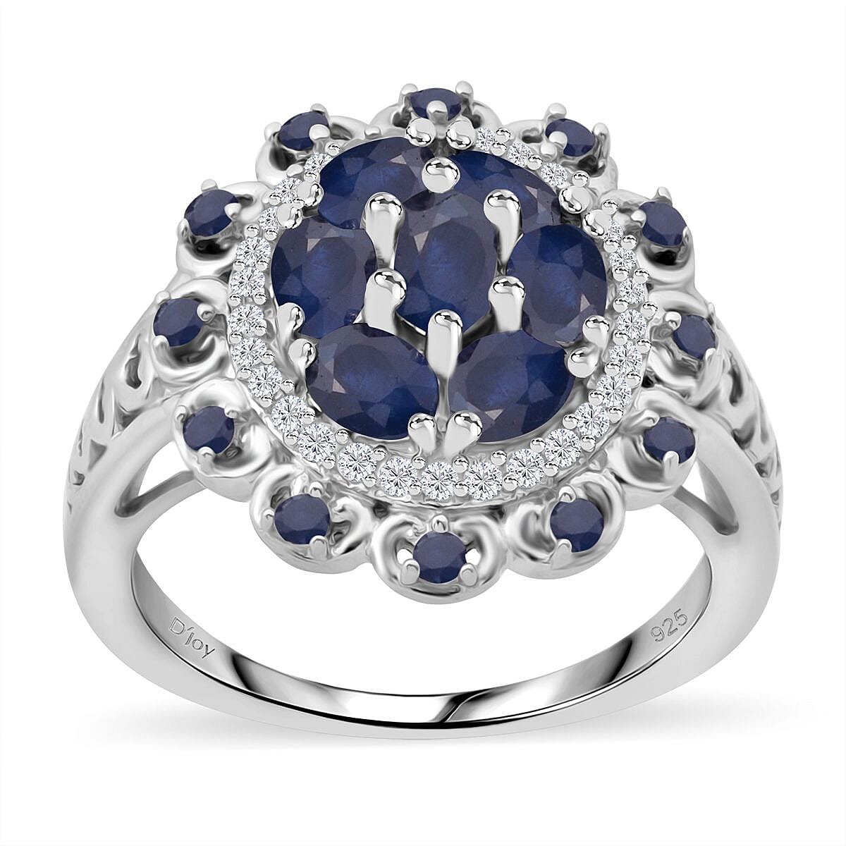Kanchanaburi Blue Sapphire and White Zircon 2.25 ctw Cluster Halo Ring in Rhodium Over Sterling Silver (Size 7.0)
