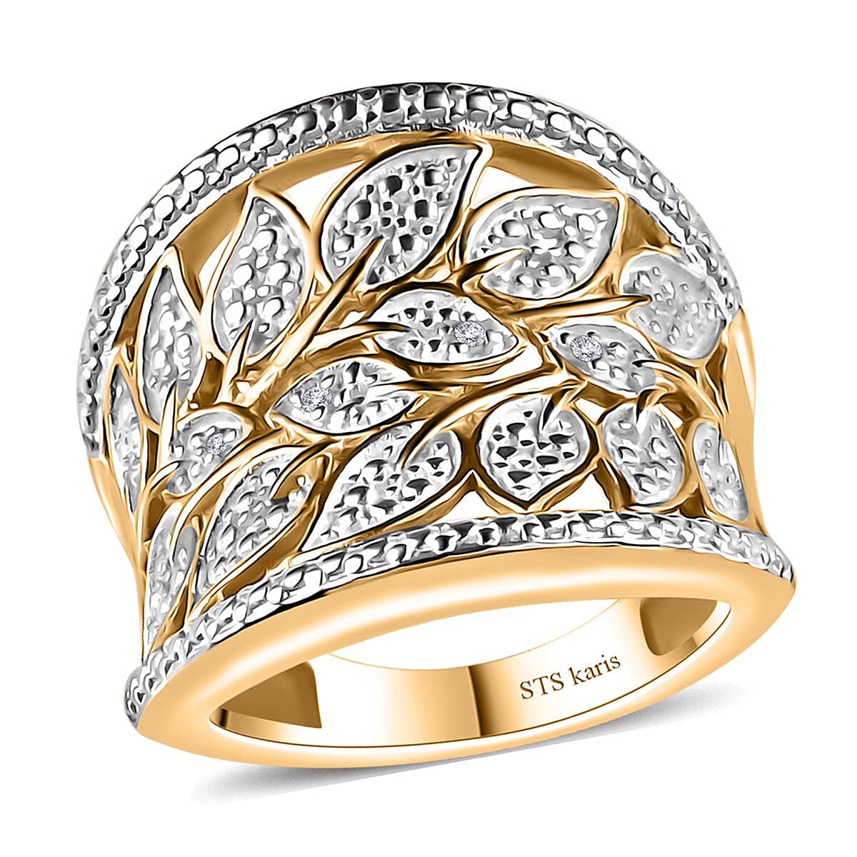 The Karis diamond accent ring, designed for women, features a dome shape inspired by leaves. This elegant piece symbolizes growth and rebirth, with diamond accents renowned for their captivating spark, durability, and brilliance.
