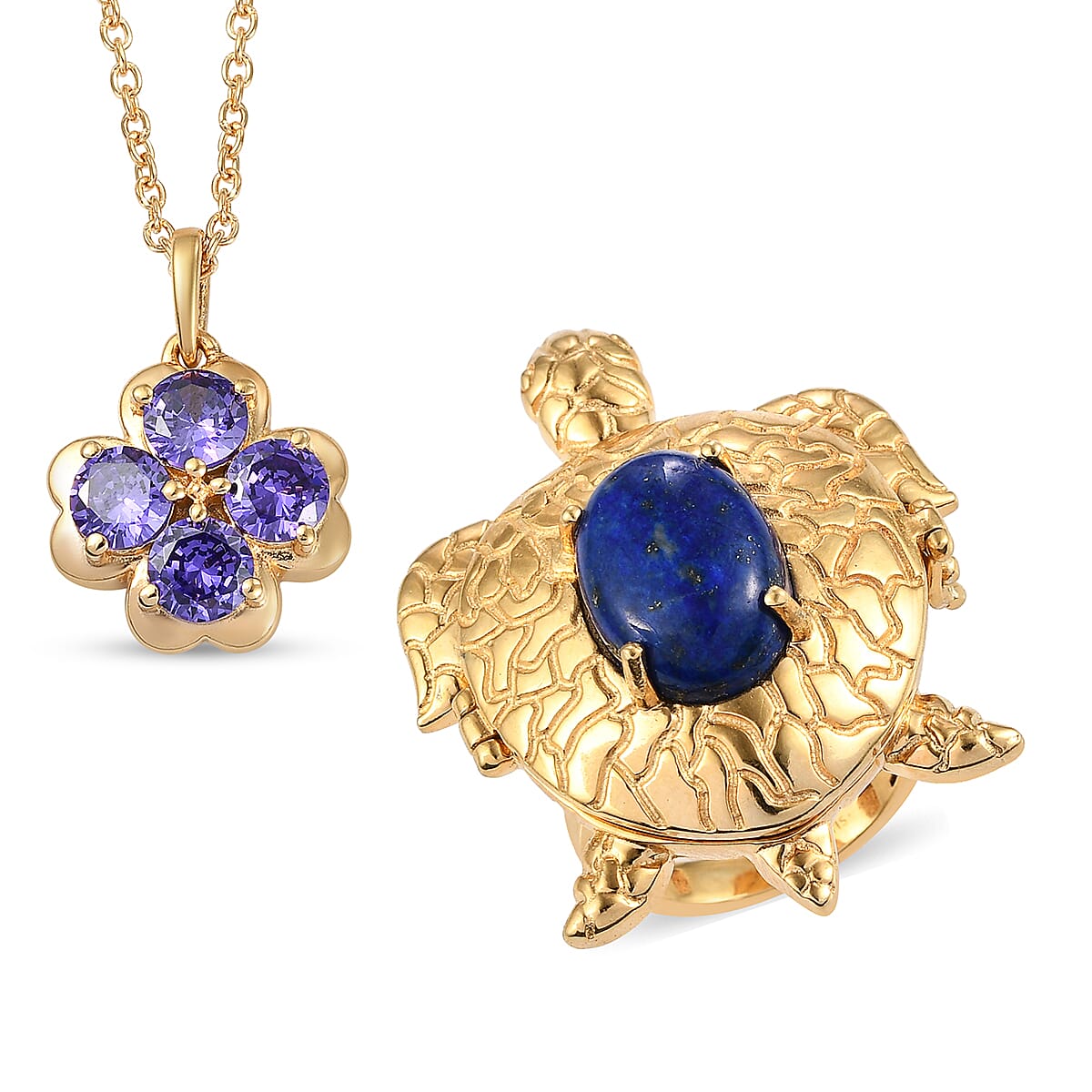 Karis Lapis Lazuli, Simulated Blue Diamond Turtle Ring Size 11 and Pendant Necklace 20In in 18K YG Plated & Stainless Steel 10.00 ctw
