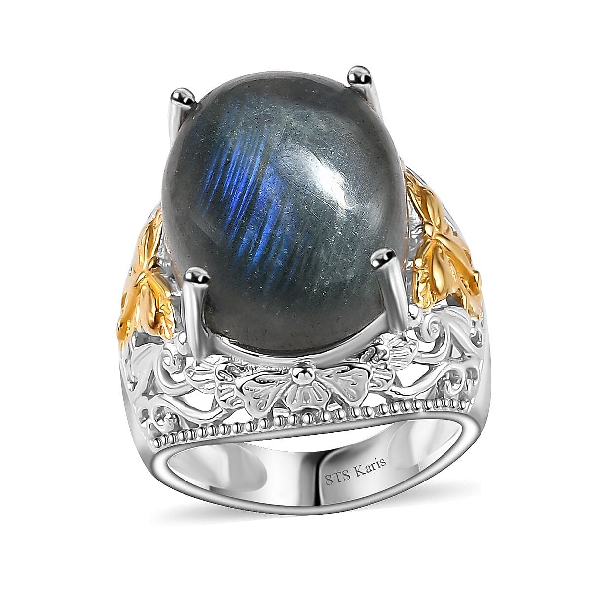 Imbue your ensemble with the timeless allure of the Malagasy labradorite solitaire ring. Crafted in 18K yellow gold plated and platinum bond, this labradorite ring features a prong-set oval-shaped labradorite center stone. Enhanced by intricate two-tone metalwork, this ring exudes sophistication and elegance.