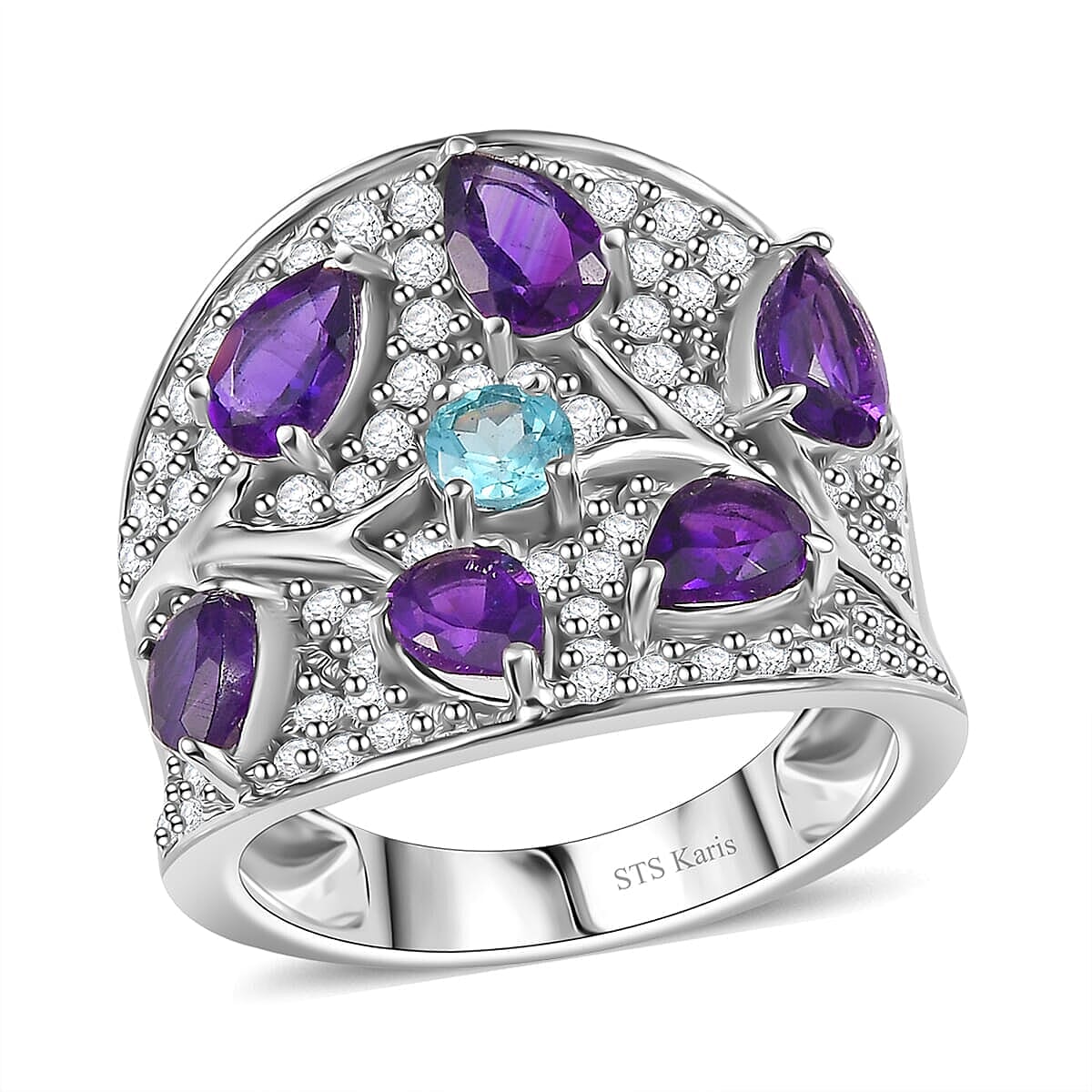 Embrace nature's elegance with the Karis amethyst and multi-gemstone ring in durable metal. Crafted with precision, this unique gemstone ring showcases an array of vibrant colors, making it a perfect amethyst ring for women seeking elegance and charm.