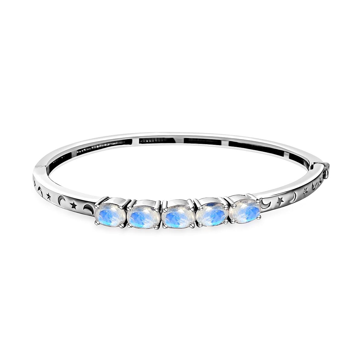 Karis Moon Glow Moonstone Moon and Star Bangle Bracelet in Platinum Bond (6.50 In) 3.60 ctw