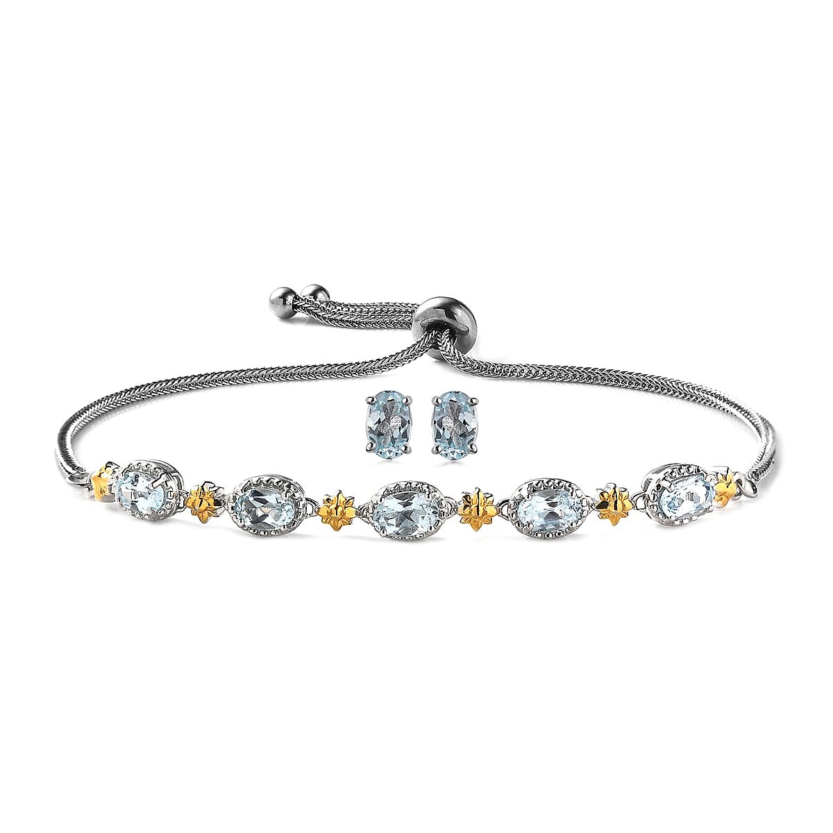 Karis Sky Blue Topaz Solitaire Stud Earrings and Bolo Bracelet in 18K YG Plated, Platinum Bond and Stainless Steel 3.75 ctw