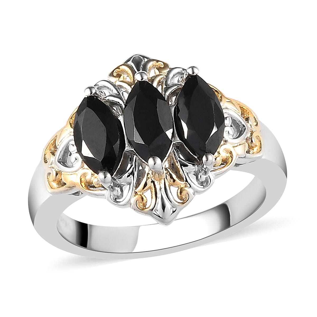 Karis Thai Black Spinel 3 Stone Ring in 18K Yellow Gold Plated and Platinum Bond (Size 8.0) 1.50 ctw
