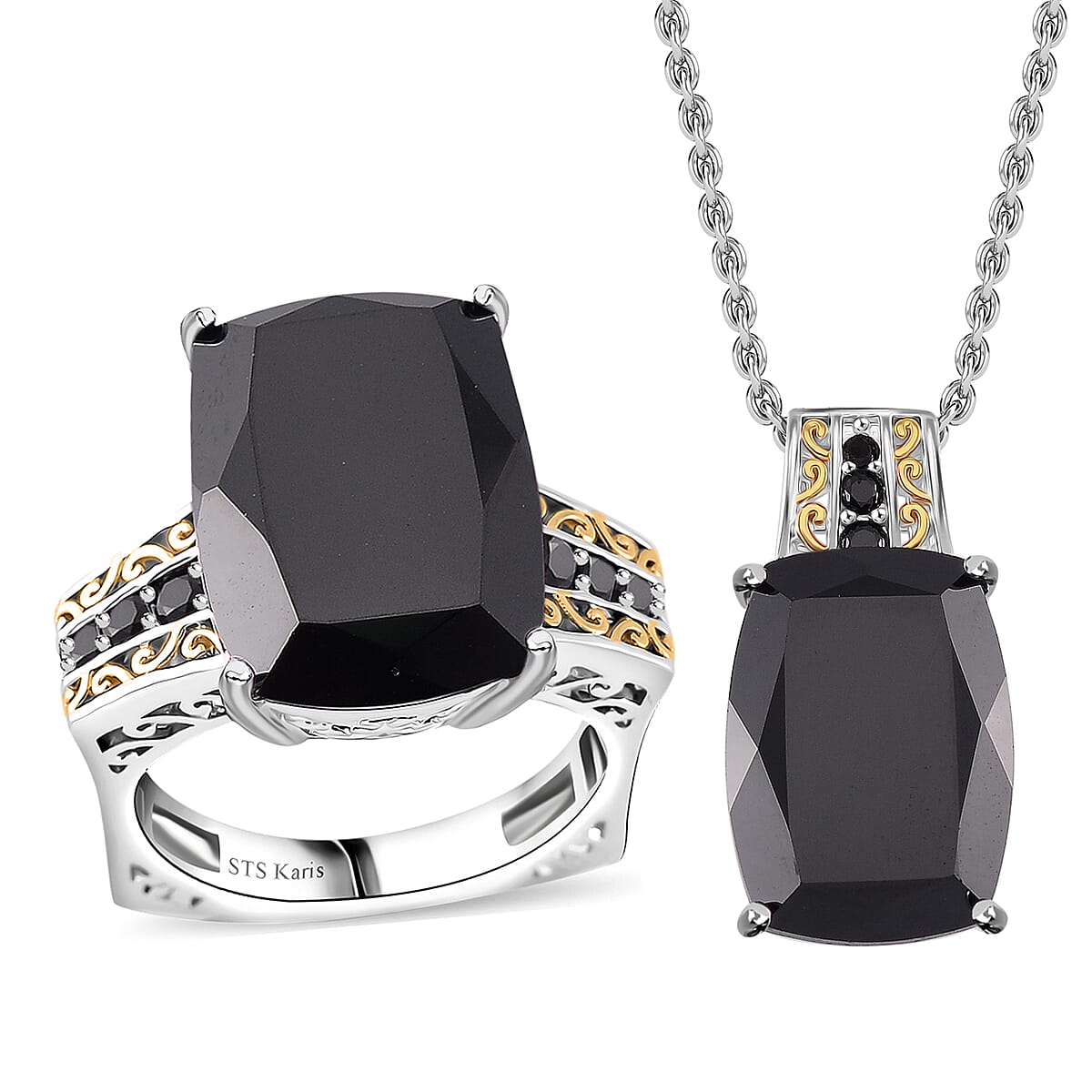 Karis Thai Black Spinel 32.30 ctw Ring (Size 6.0) and Pendant in Dualtone with Stainless Steel Necklace 20 Inches