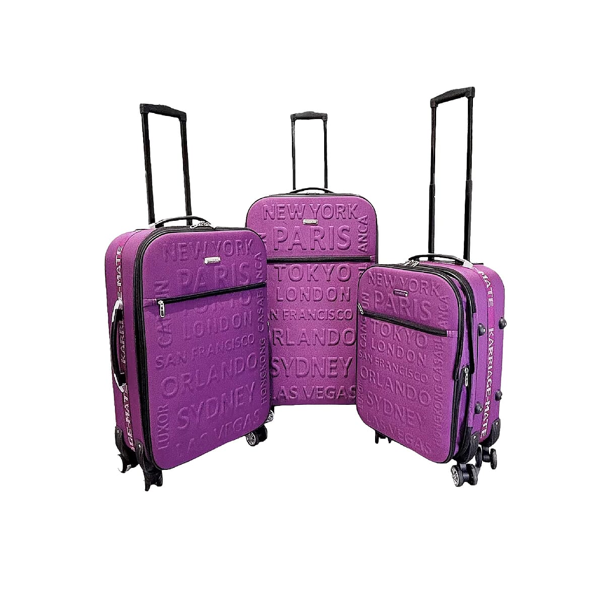 Travel Made Easy with the Karriage mate 3pc expandable softshell spinner luggage set! Store your essentials effortlessly and securely with each spacious, expandable piece. Glide through terminals with smooth-rolling spinners designed for the savvy traveler.