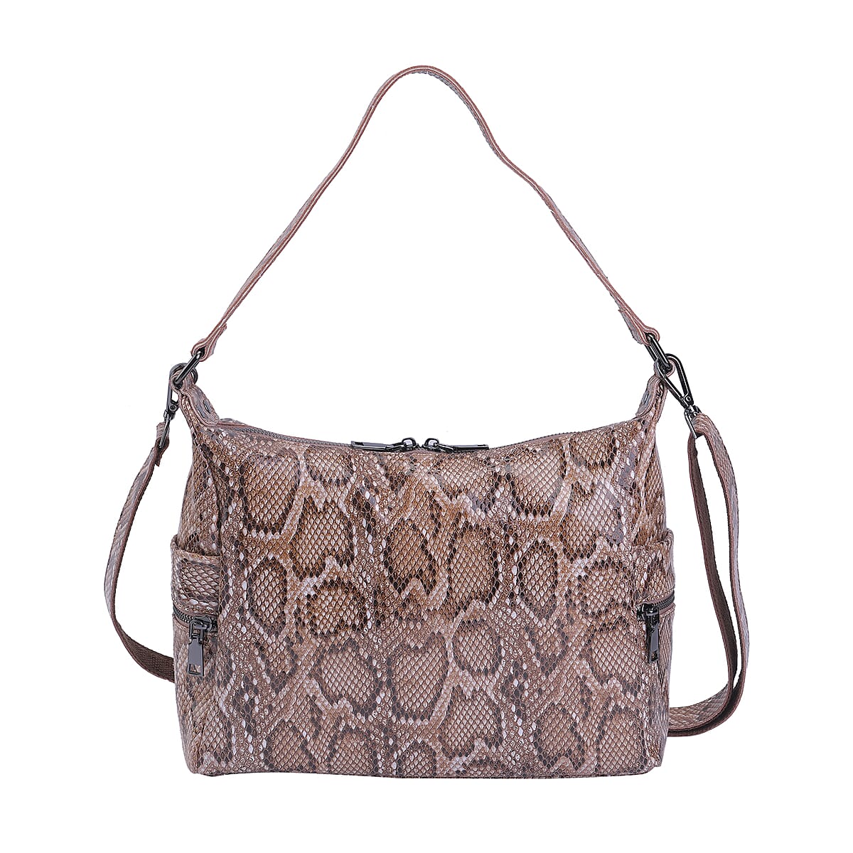 Khaki and Black Python Embossed Print Genuine Leather Hobo Bag with Shoulder Straps