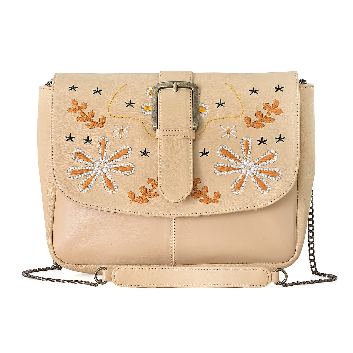 LA Marey Beige Genuine Leather Embroidery Work Crossbody Bag