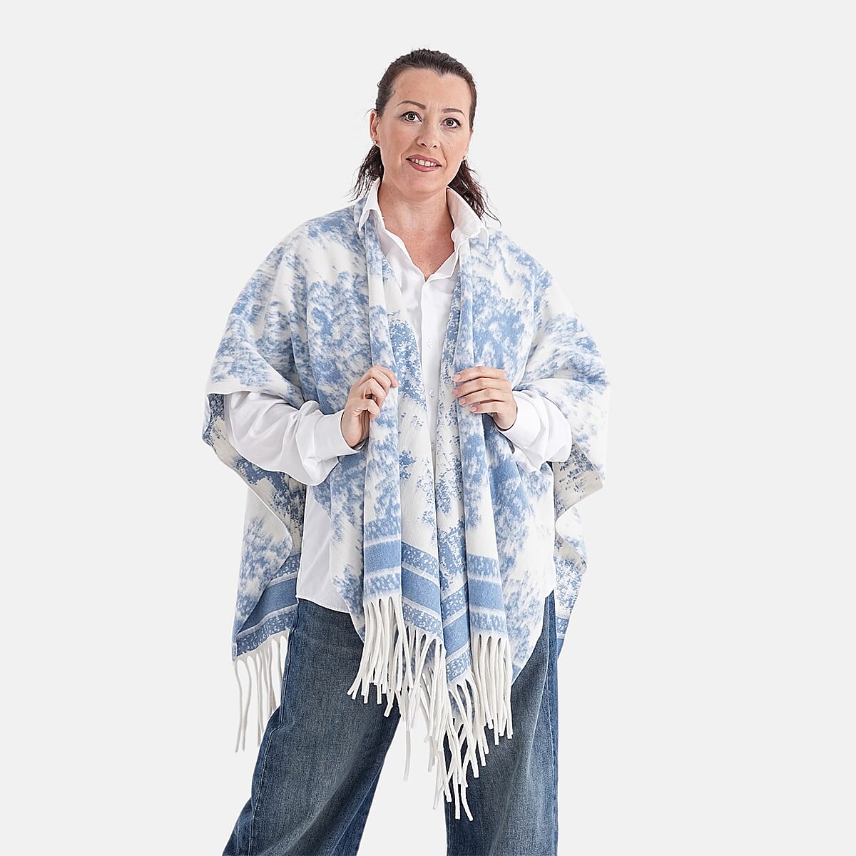 La Marey Beige with Light Blue Pattern Tassel Poncho