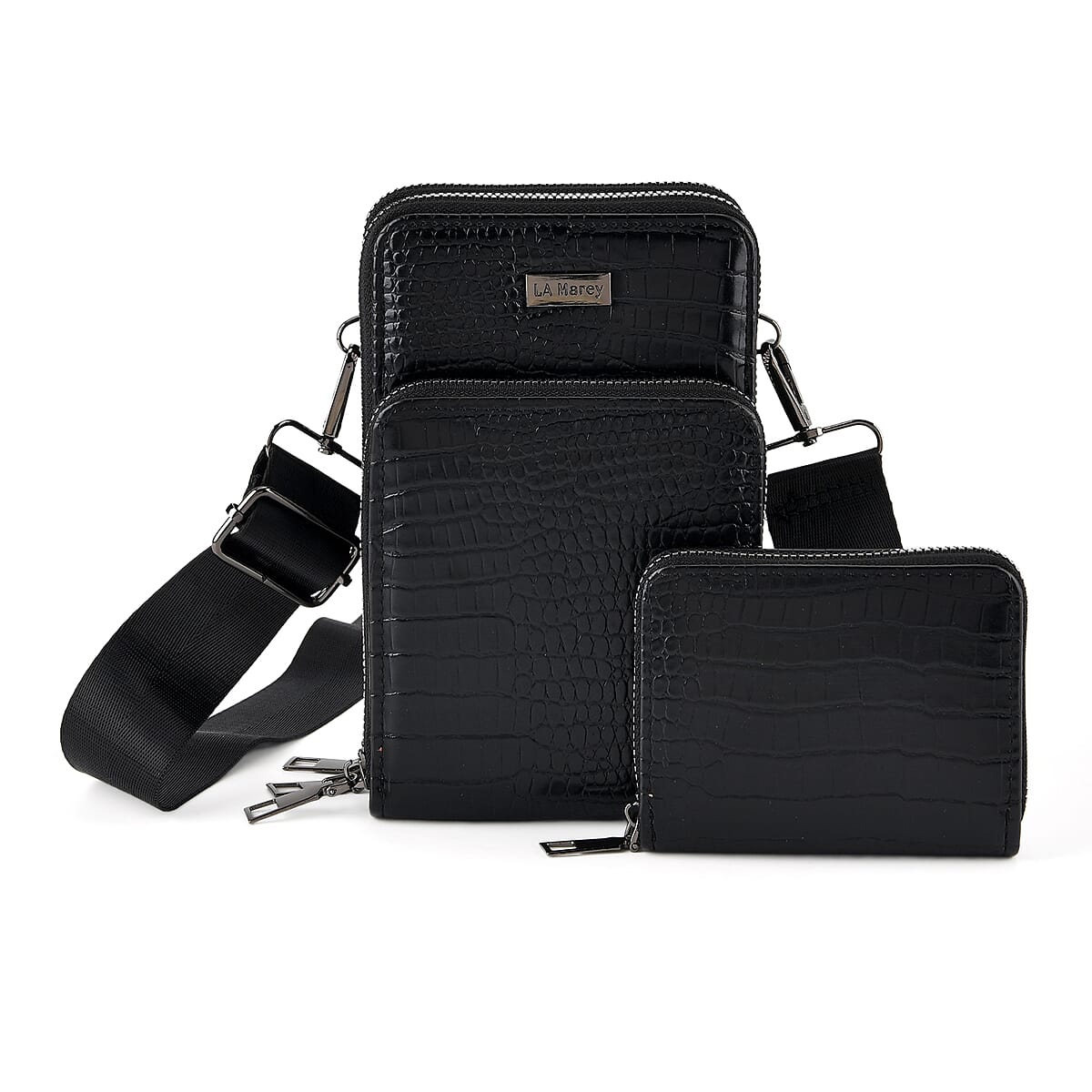 La Marey Black Faux Leather Crocodile Pattern Phone Bag with Woven Strap