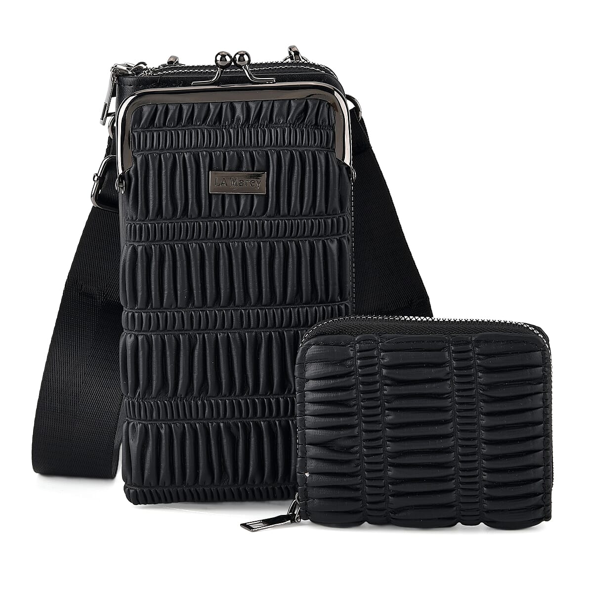 La Marey Black Faux Leather Pleated Phone Bag with Woven Strap