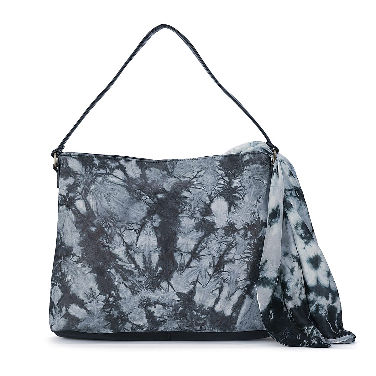 LA Marey Black Genuine Leather Tote Bag with Silk Scarf