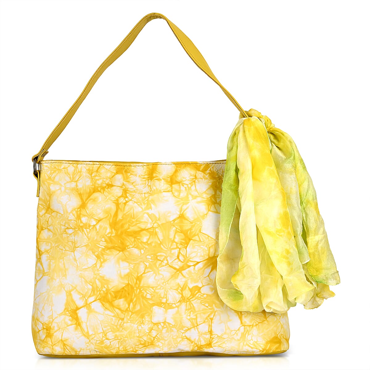 La Marey Champagne Floral Pattern Genuine Leather Tote Bag with Silk Scarf