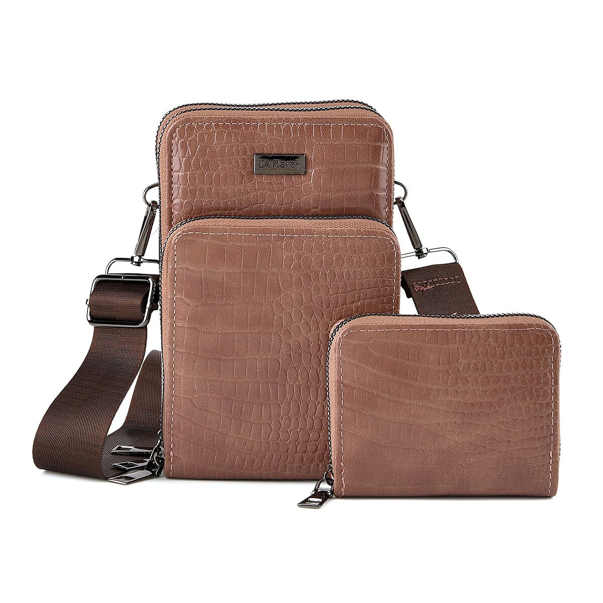 La Marey Dark Brown Faux Leather Crocodile Pattern Phone Bag with Woven Strap