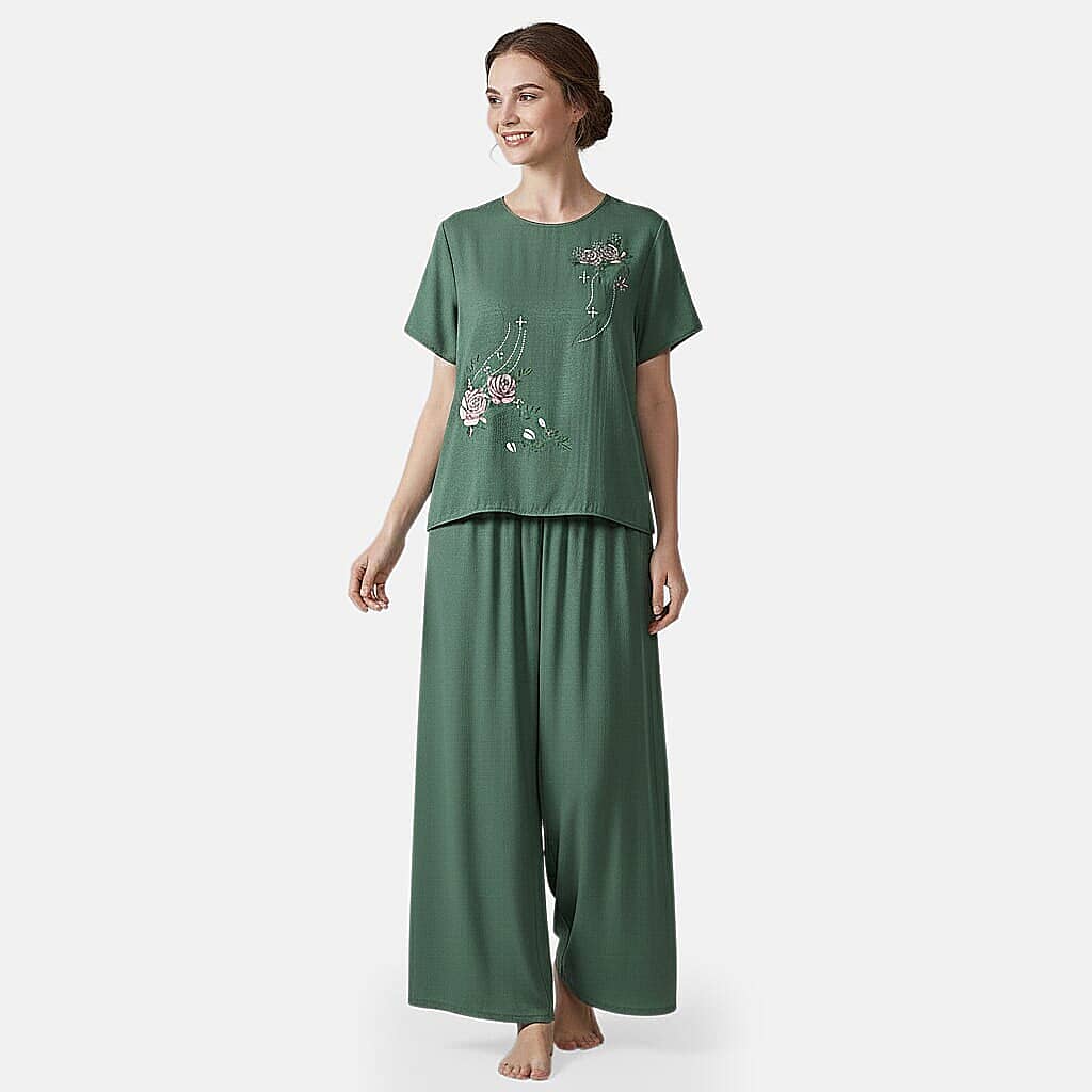 La Marey Green Floral Short Sleeve Top and Wide Leg Pants - One Size Fits Most
