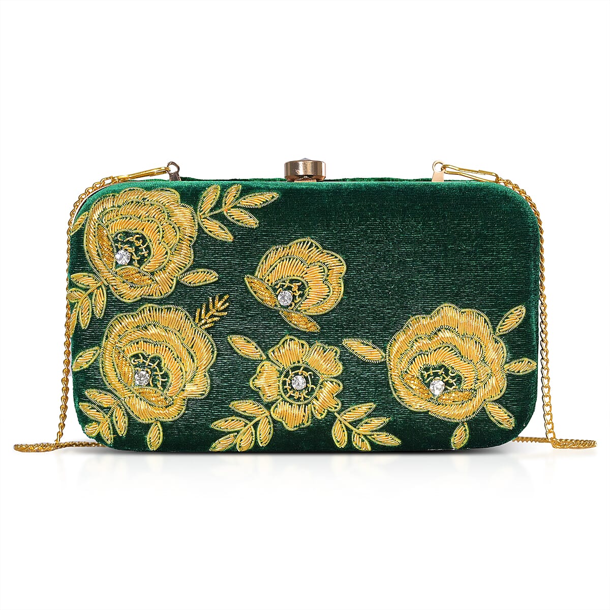 La Marey Green Velvet Bead Work Clutch Bag with Chain Strap