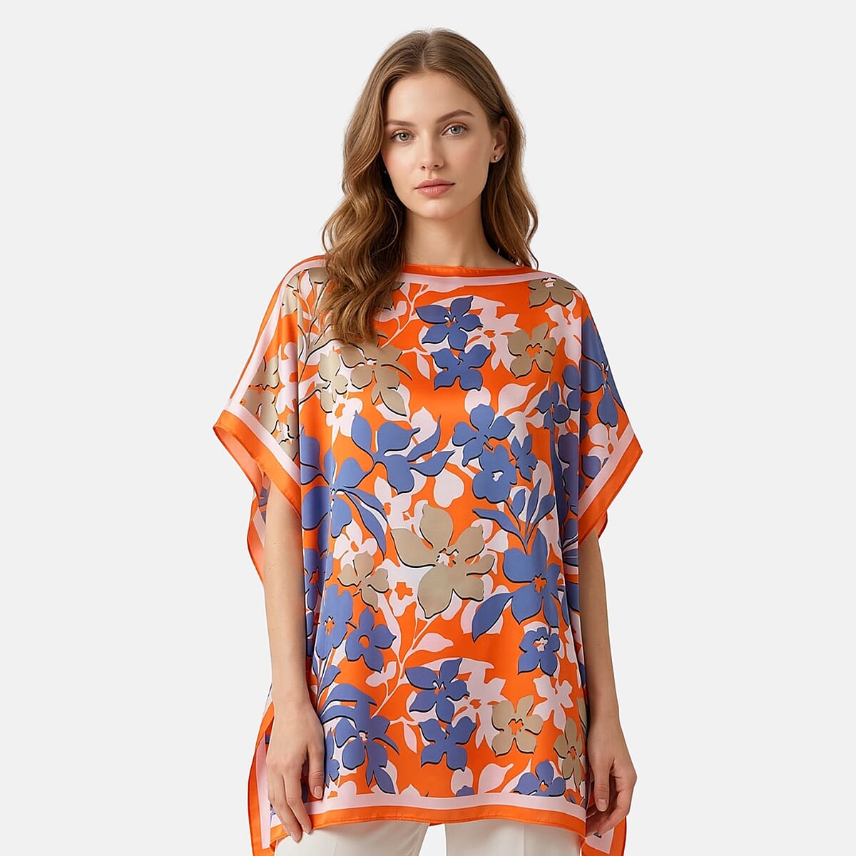 La Marey Orange and Blue Floral Silky Kaftan Boat Neck Top