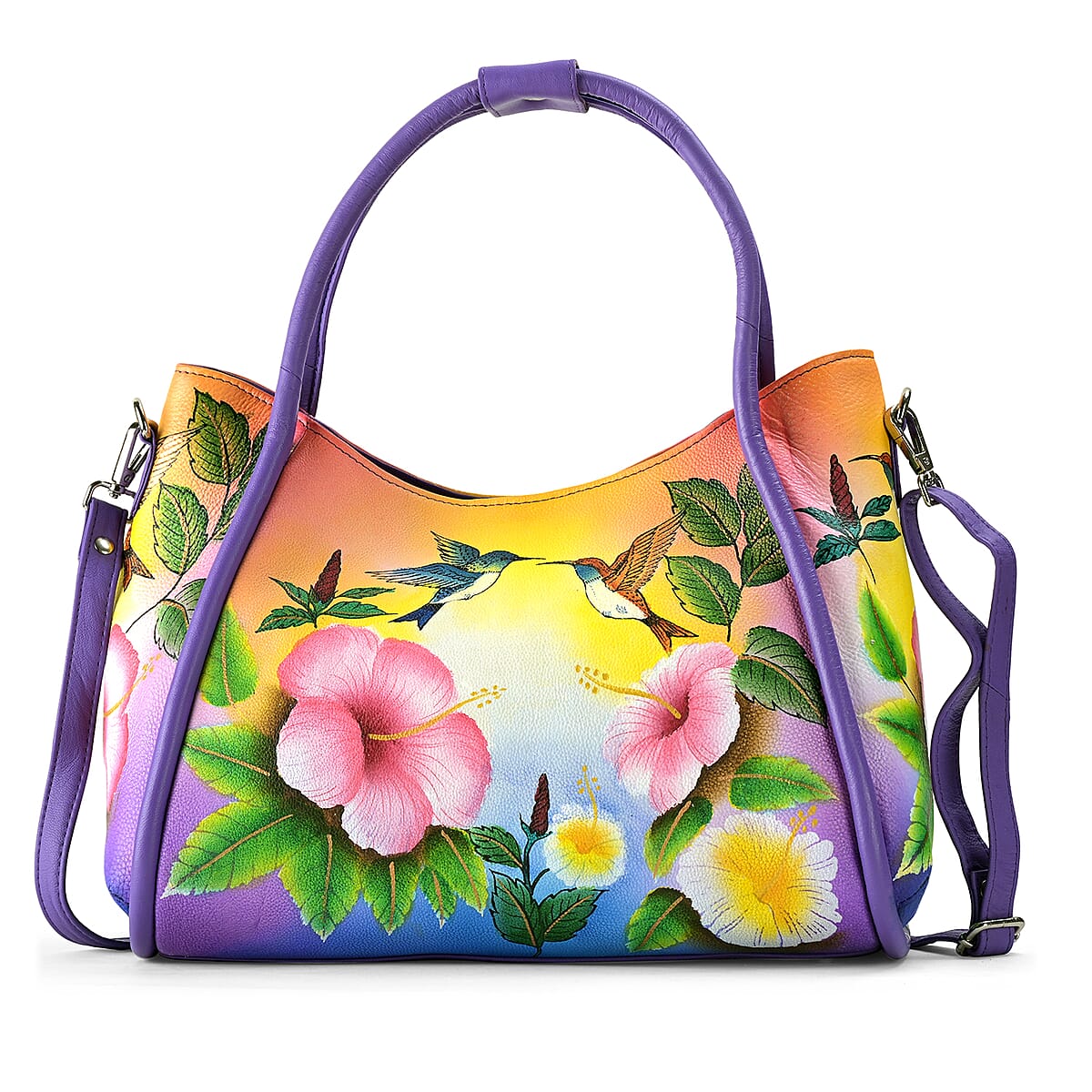La Marey Purple Floral Hand Painted Genuine Leather Handbag with Shoulder Strap