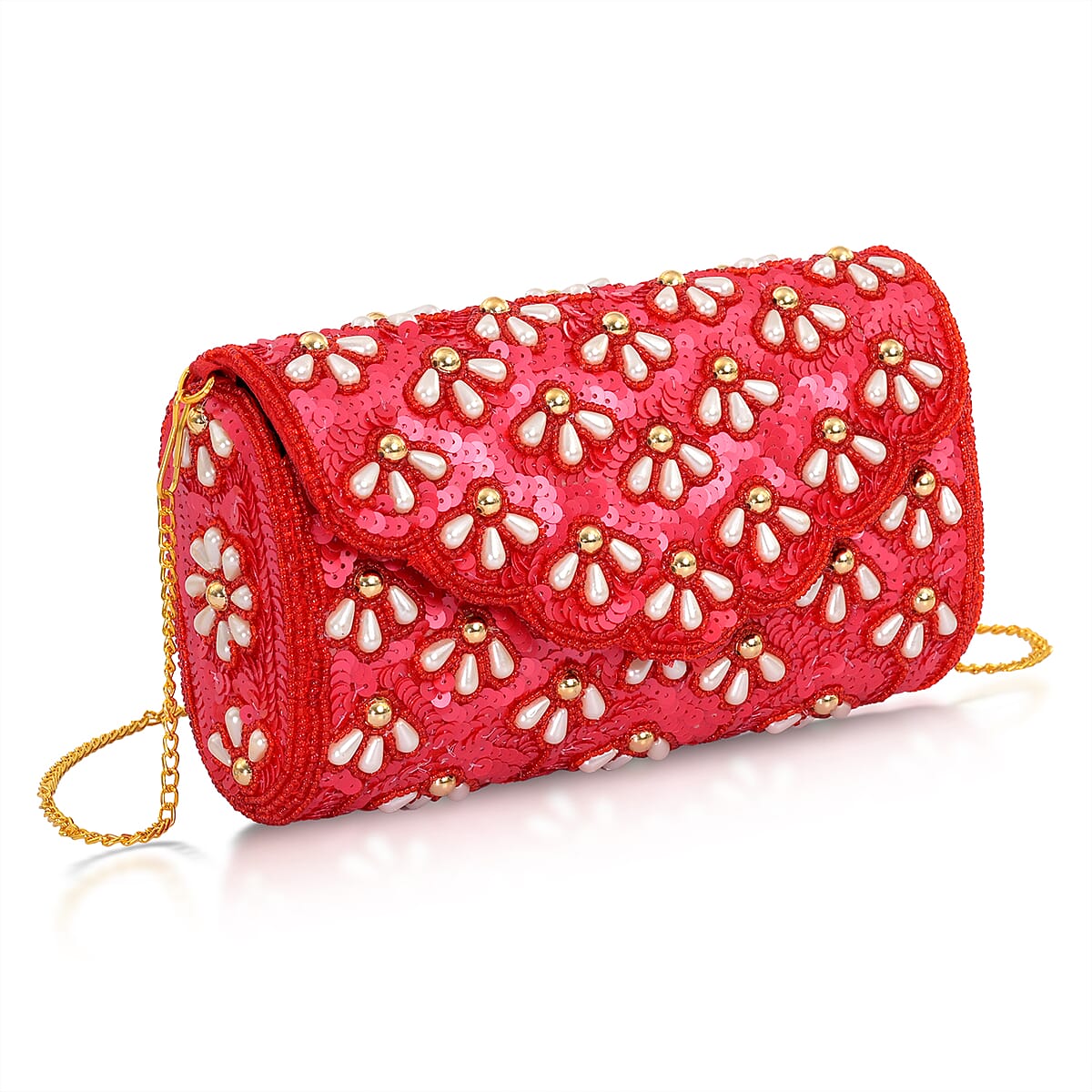 La Marey Red Bead Work in Dupion Silk Sling Bag with Shoulder Chain Strap