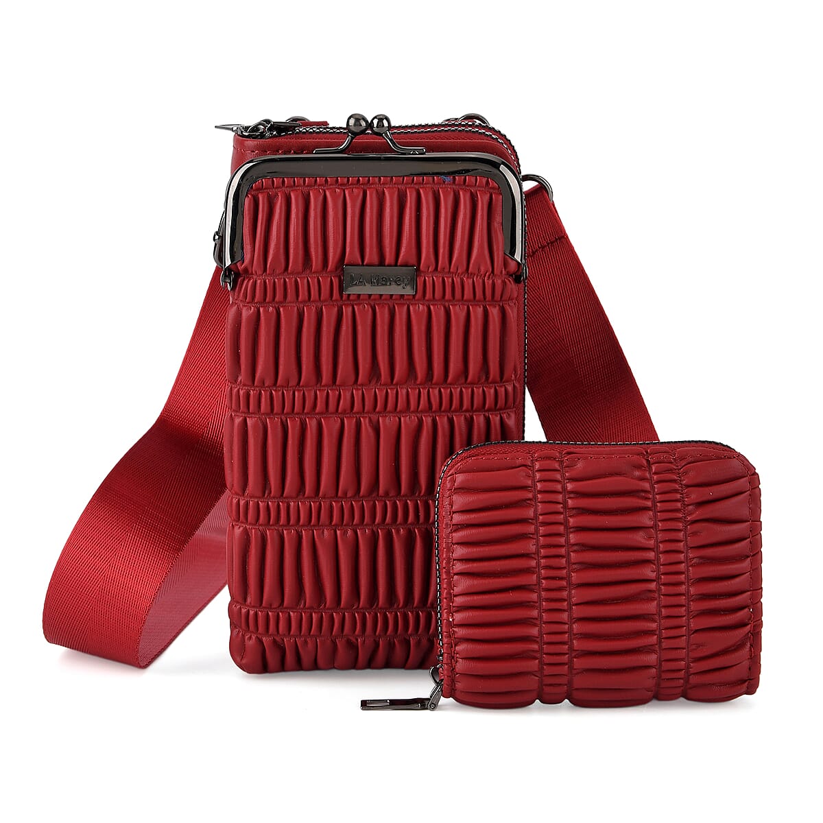 La Marey Red Faux Leather Pleated Phone Bag with Woven Strap