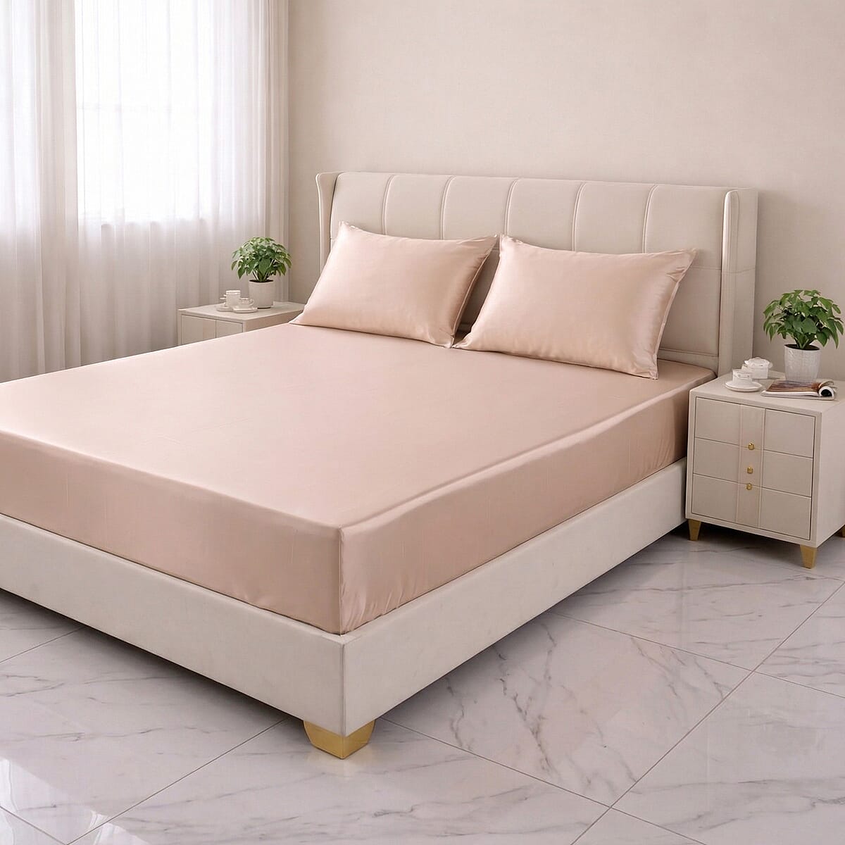 Indulge in restful nights with La Marey signature print sheet set. This 4-piece sheet set includes everything for complete bedroom luxury. Breathable mulberry silk sheets cradle you in ultra-soft comfort nightly. Wake refreshed and ready to embrace each new day.