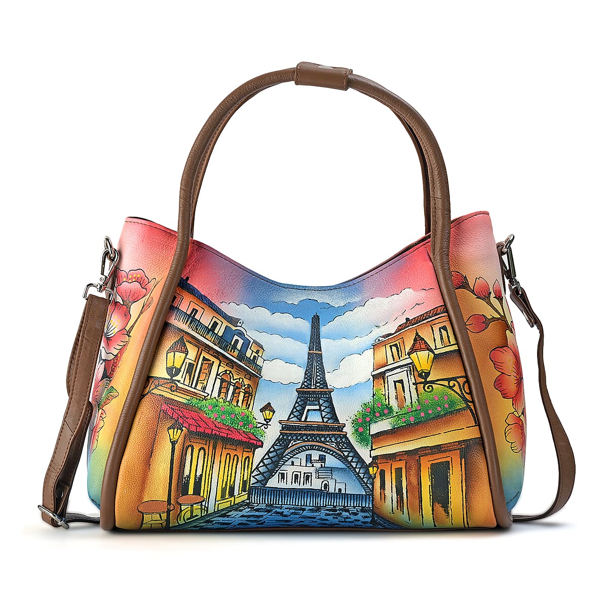 La Marey Tan Eiffel Tower Hand Painted Genuine Leather Handbag (12.59"x9.84"x5.90") with Shoulder Strap