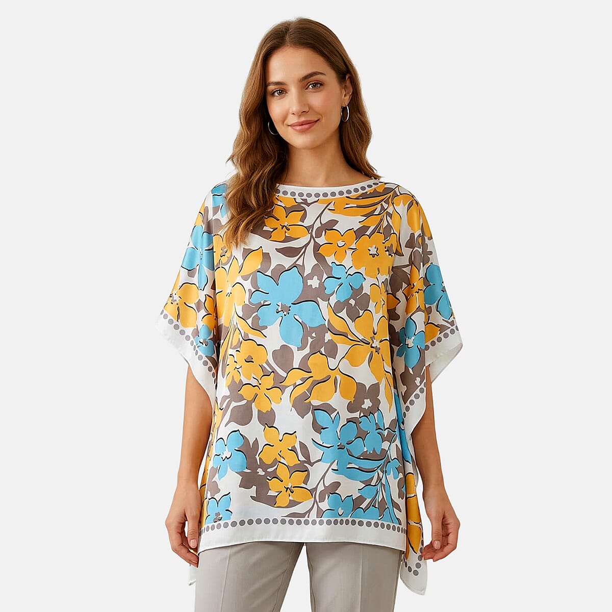 La Marey White and Blue Floral Silky Kaftan Boat Neck Top
