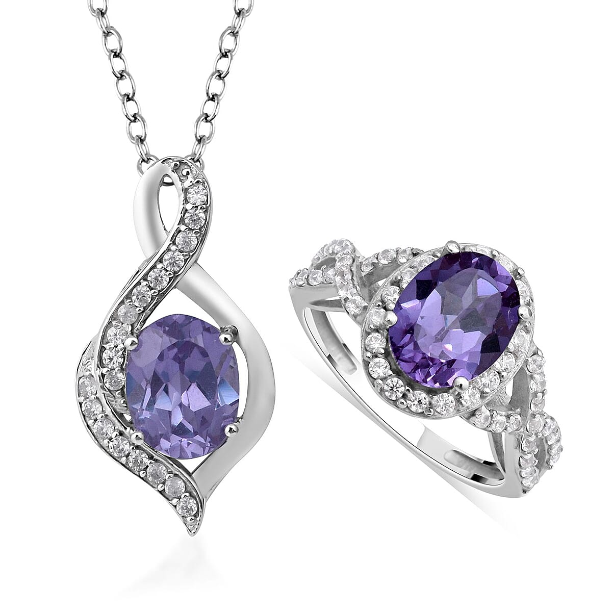 Lab Created Alexandrite, White Zircon Ring Size 8.0 and Pendant Necklace 18 Inches in Platinum Over Sterling Silver 6.10 ctw