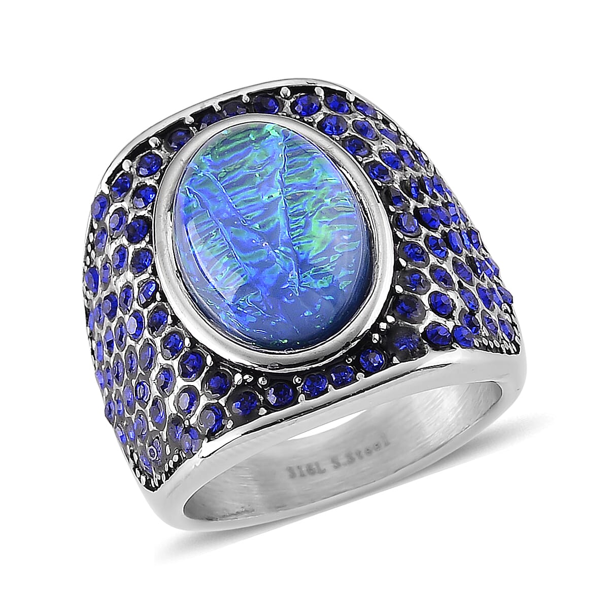 Lab Created Blue Opal and Austrian Crystal Royal Midnight Mirage Ring in Stainless Steel (Size 8.0)